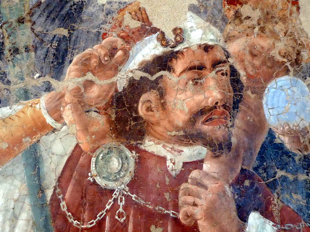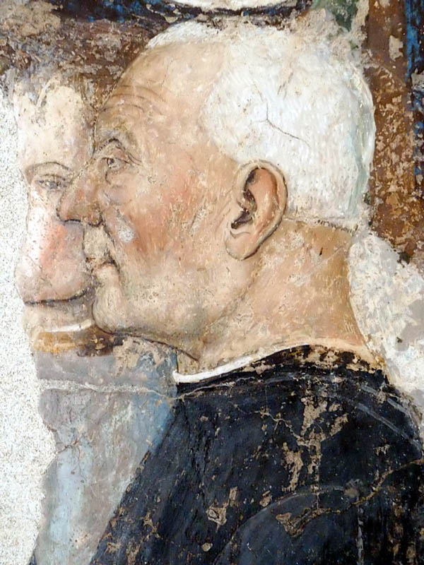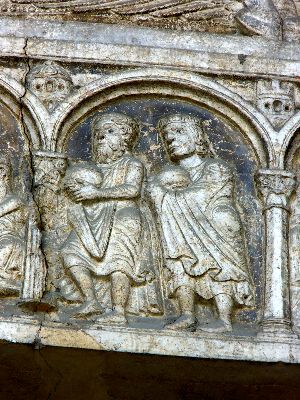 Der Künstler hat versucht, die Reihe der Reiter in die Bildfläche vertieft perspektivisch darzustellen und auch bei den Fusstruppen mehrere Reihen hintereinander zu geben. Das widerspricht dem klaren und einfachen Reliefstil des Nikolaus. Auch sind die Reliefs an dem Architrav im Ausdruck lange nicht so bedeutend, wie die Darstellungen an der gleichen Stelle des Domes von Ferrara. An diesen Reliefs ist die Bemalung ziemlich gut erhalten. Der Grund ist blau, die Gewänder sind grösstentheils grün.