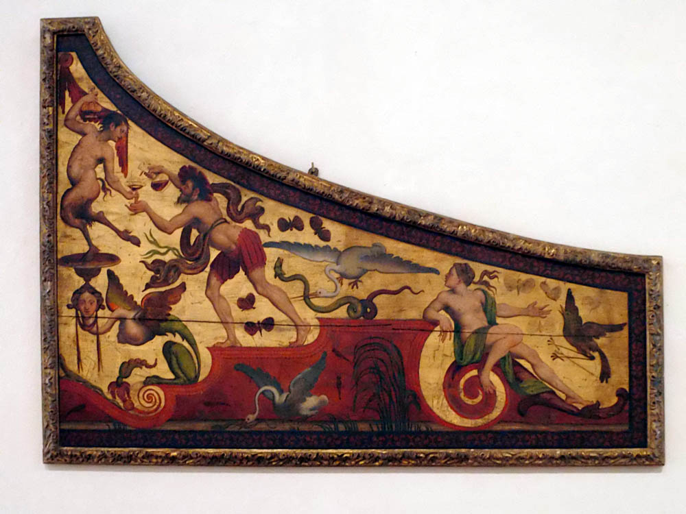 In den beiden Lünetten, welche die beiden senkrechten Reihen von Relieffeldern oben abschliessen, sind dargestellt links ein Kentaur, der einen Drachen mit der Rohrflöte schlägt, rechts ein Esel, welcher Zither spielt. Zu beiden Seiten und zwischen den Rundbogen ragen die Halbfiguren von Löwen hervor.