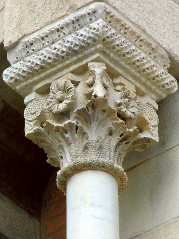 An der Fassade des Vorbaus sind in den Rand des Rundbogens Kassetten vertieft, auf deren Grund Blattrosetten liegen. Im Scheitelpunkt ist das Lamm mit dem Kreuze angebracht. Zu beiden Seiten des Bogens stehen in hohem Relief zwei Gestalten, in welchen wir nach Analogie des später zu besprechenden Vorbaus von San Zeno zu Verona die beiden Johannes erkennen, rechts Johannes den Täufer, der auch durch ein Fell um die Schultern kenntlich gemacht ist, und links Johannes den Evangelisten als Verfasser der Apokalypse mit einem Buch in der Hand, ersterer auf die Heilslehre Christi vorausdeutend, letzterer sie zu erhabenen Visionen ausgestaltend. Der Täufer streckt die Hand aus, hinweisend auf den, der da kommen soll, in der anderen Hand hält er eine Schriftrolle, die übliche Weise, anzudeuten, dass die dargestellte Person spricht. Johannes der Evangelist steht innerlich gesammelt da. Ueber den Köpfen dieser Reliefiguren zieht sich je ein Streifen mit schönem Rankenornament hin, und zwar besteht jeder aus zwei verschiedenen Stücken, antike Reste, die hier verwerthet sind. Die Konsolen des kleinen Gesimses, welches nach dem späteren Oberbau den Abschluss bildet, sind kleine Menschenköpfe mit fratzenhaften Gesichtern. Wie der plastische Schmuck sind auch der Blätterschmuck aller Kapitelle, die geometrischen Verzierungen der Säulchen und Rundstäbe bescheiden gehalten, um die herrschenden architektonischen Linien möglichst hervortreten zu lassen.