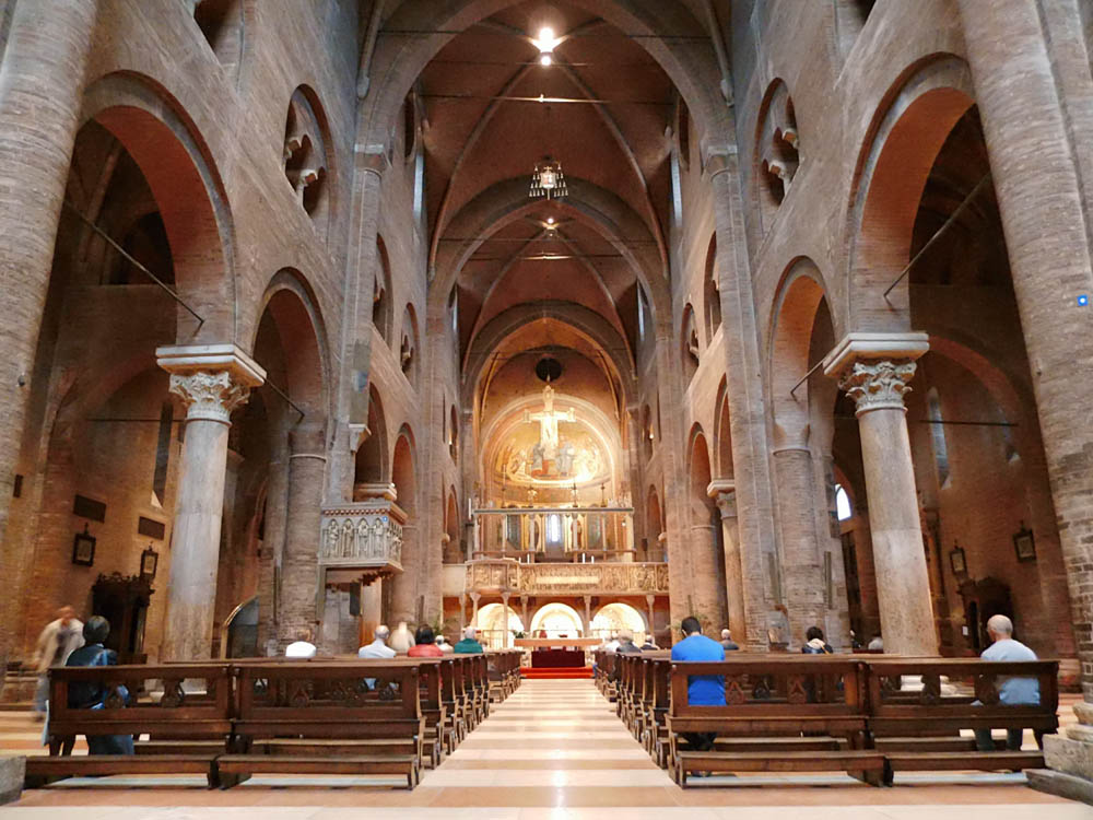 Säulen. Die hinteren sind glatt, die vorderen schlankeren sind geometrisch verziert und stehen auf dem Rücken von Greifen, von denen einer die Räder an der Seite hat, wie zu Ferrara. Das statische Moment ist an der Stirnzeite der Architrave über den Säulen unter dem Tonnengewölbe der Vorhalle durch kauernde Träger ausgedrückt. Im Innern des Tonnengewölbes dicht über den Architraven sind in Relief die vier Evangelistensymbole dargestellt. Die Freude am Schmuck geht so weit, dass das ganze Tonnengewölbe mit parallelen Streifen ausgelegt ist, welche durch Ornamente oder durch die von Ferrara bekannten Kassetten mit Thieren verziert sind.