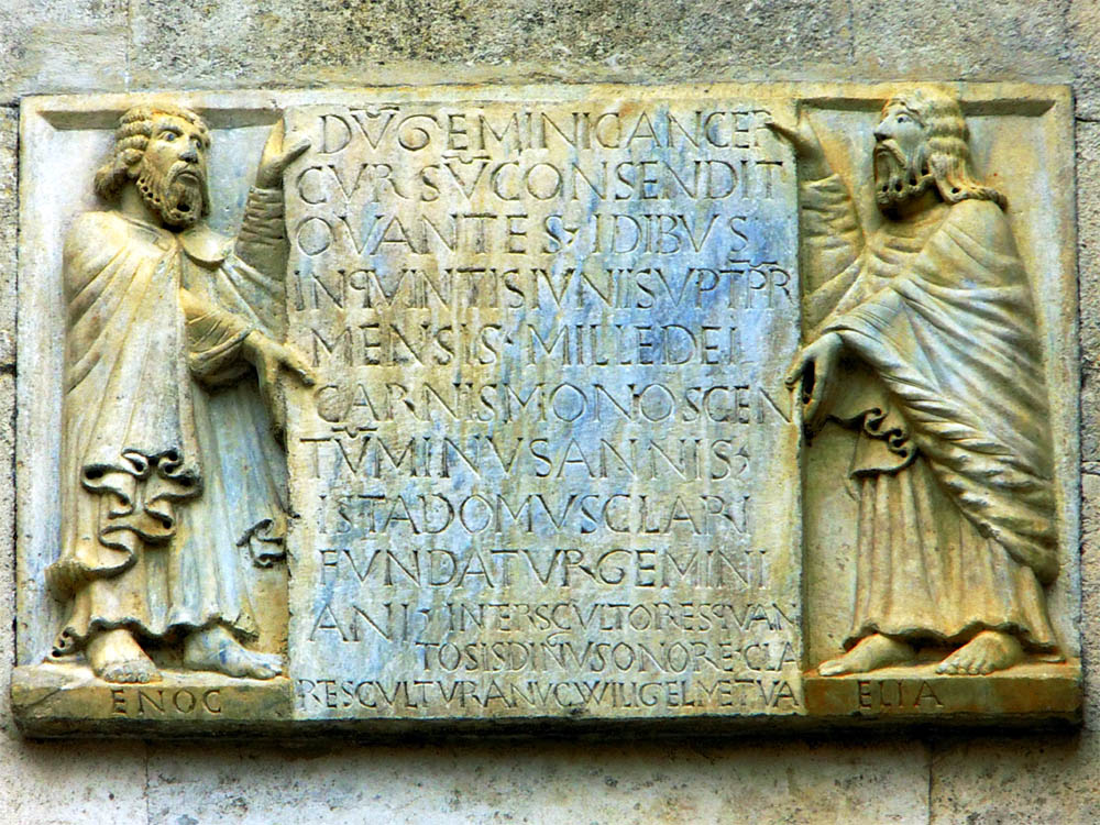 Diese Verse sollen nach Borsetti (Hist. Gymn. Ferr. Tom. I p. 357) auf einem Zettel in der Hand eines Propheten gestanden haben. Bei Baruffaldi ist dieser Zettel mit der Inschrift abgebildet. Frizzi: Memorie per la Storia di Ferrara. p. 126 ff. erklärt diese Verse für modern. Das Richtige giebt F. Avventi in seinem Buch II Servitore di Piazza: Guida per Ferrara 1838 S. 25. Er sagt, die Mosaikinschrift über dem Hochaltar wäre im Jahre 1570 durch ein Erdbeben zerstört und seitdem verändert neu gemalt worden. Die ursprüngliche Fassung lautete: