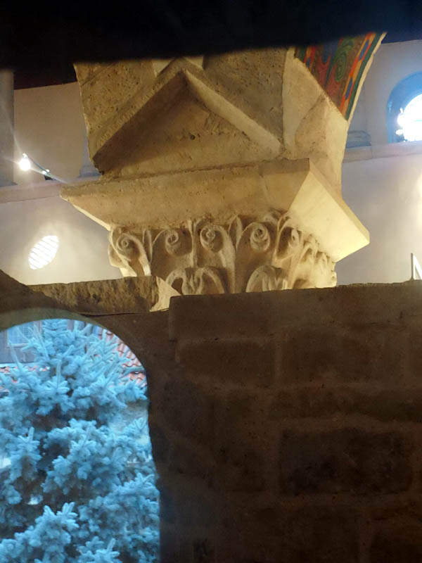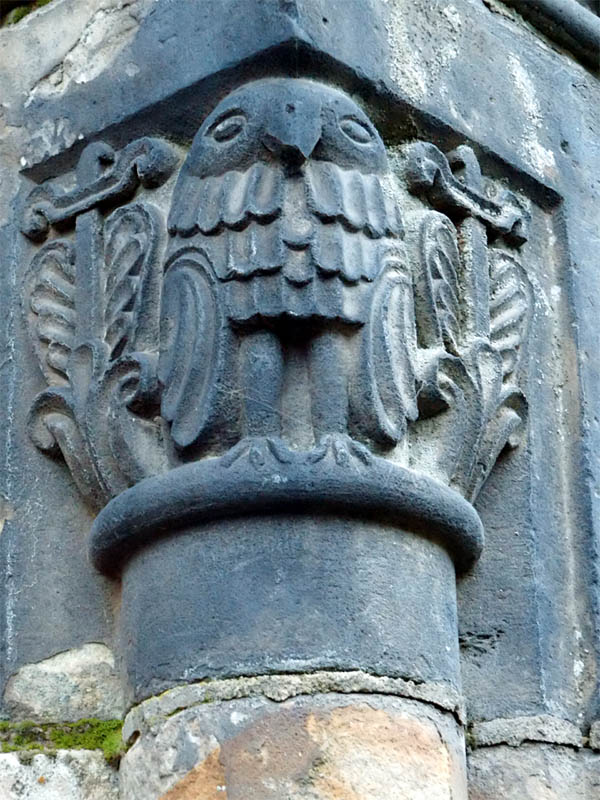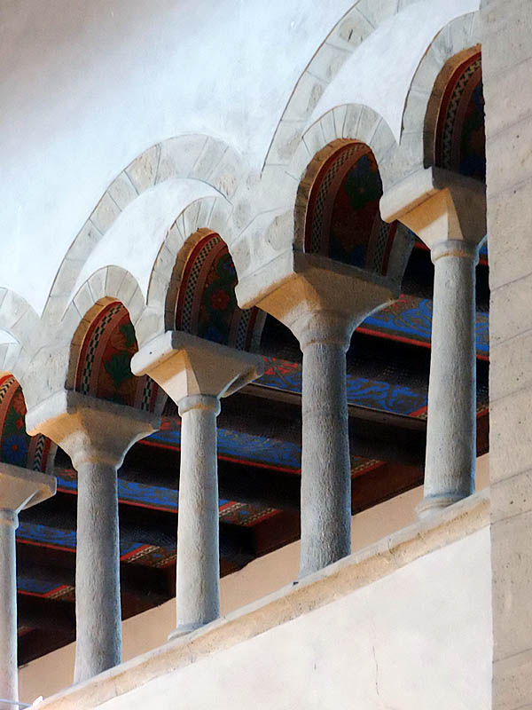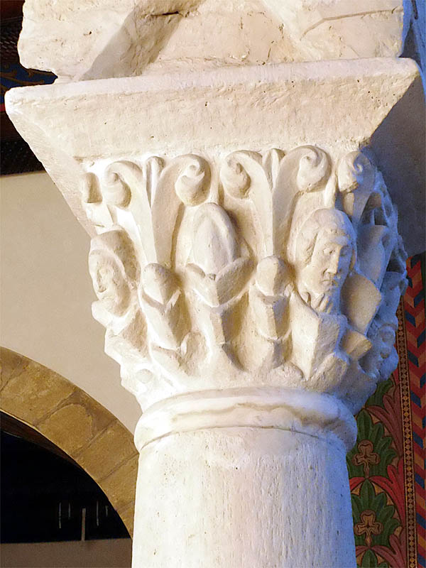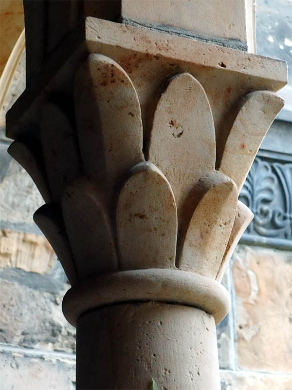Charakter und ungleicher Qualität. Auf dem einen Kapitell sind dem Adler auf der Ecke, der fast wie eine Eule aussieht, zwei einzelne byzantinische Blüten zur Seite gesetzt in der Gabelform, wie sie an der Westseite vorkommt. Die Stengel haben den trapezförmigen Querschnitt wie die Rankenstengel außen. Auf zwei weiteren Kapitellen sind in gleicher Weise bei beiden drei horizontal übereinanderliegende Blätter angebracht, die ebenfalls aus der Ornamentik der Westseite wie herausgenommen aussehen. Ohne die Wange befriedigend zu füllen, stehen sie horizontal aus der Wand heraus. Bei zwei anderen kommen die Stengel des vom Halsring aufsteigenden Pflanzenwerks aus einem wellenartigen Grunde und geben kein klares Bild. Das Profil dieses Ornaments ist das flacher, weicher Rillen. Es sind dieselben Blätter wie außen, die jedoch ganz klein und versteckt in langen Formen auf der Ecke des Kapitells als zwei Palmetten zusammentreffen. Ein Kapitell ist ganz glatt gelassen und die Basis hat auch keine Eckklötzchen.