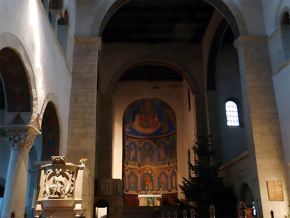 Tumba oder mit den Stuckfiguren entstanden. Im Muster ganz ähnliche Marmorfußböden, ebenfalls im Charakter des opus alexandrinum nach italienischem Vorbild, finden sich in Deutschland z. B. zu Cöln in St. Severin 1) und in Werden 2). Wie bei den Stuckfiguren dürfen wir auch hier auf rheinischen Einfluß schließen, da Effmann den Werdener Fußboden schon für das zweite Drittel des XI. Jahrhunderts nachweist.