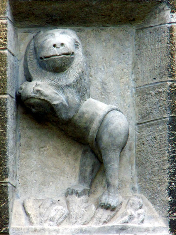 Das untere Feld von diesen beiden ist in der Mitte durch ein eingeschobenes Teilungsstück, dessen Material Stuck ist, in horizontaler Richtung noch einmal geteilt. Da die Umrahmungsglieder von Sandstein und Kalkstein sind, und da dieses ornamentierte Stuckprofil ohne Verband mit dem übrigen ist, darf man es als nachträgliche Zutat ansehen. Das Feld links unten ist mit dem Fragment einer Kalksteinplatte zum Teil gefüllt. Die korrespondierenden Felder: rechts unten und links und rechts oben sind glatt geputzt, ebenso das untere mittlere Feld. Die noch übrig bleibenden drei Felder: das obere mittlere und die beiden rechts und links in der Mitte sind mit Stuckplatten gefüllt. Auf den seitlichen Feldern sind links Christus und rechts eine heilige Frau dargestellt, beide in ganzer Figur.