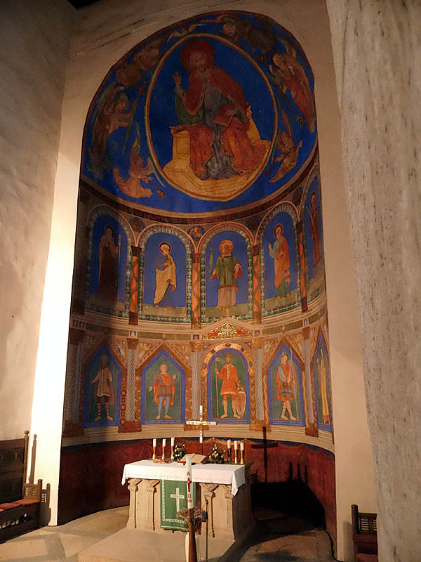 Die Auferstehungsdarstellung im Tympanon über der Tür ist am besten erhalten, nur der Kopf Christi ist abgefallen. Die Darstellung bietet auch das meiste Interesse. Der Auferstandene steigt aus dem offenen, mit der Langseite in der Bildebene stehenden Sarkophag, ein Bein stellt er vor die Wand. Christus ist bekleidet mit einem roten Mantel, mit der Rechten segnet er, und in der Linken hat er die Siegesfahne. Vor dem Sarkophag liegt ein Krieger am Boden, einer lehnt links sich mit seinem Schild schlafend auf den Sarkophag. Ein dritter erhebt staunend die Rechte und ist mit weit geöffnetem Munde dargestellt. Der rote Grund hinter den Figuren ist mit weißen Sternen besetzt. Die Türpfosten unter dem Bild sind mit derselben roten Farbe umrahmt. Da auf jeder Seite zwei Türangeln angebracht sind, wird eine hölzerne Flügeltür dort gesessen haben, die dann auch bemalt war.