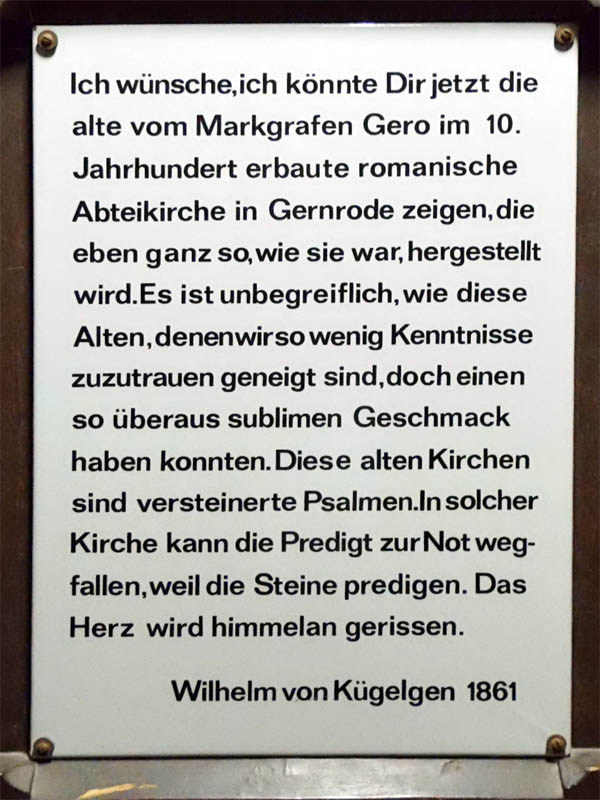1) L. Puttrich, Denkmale der Baukunst des Mittelalters in den Herzoglich Anhaltischen Landen, 1841, S. 39—45. — E. F. Ranke und F. Kugler, Beschreibung und Geschichte der Schloßkirche zu Quedlinburg, 1838, S. 109, ff. Wiederholt in F. Kugler, Kleine Schriften und Studien zur Kunstgeschichte, 1853, I. 604.—O. v. Heinemann, Geschichte der Abtei und Beschreibung der Stiftskirche zu Gernrode 2. Aufl. 1877. — Desgl. in Zeitschrift des Harzvereins, 1877. -- F. Maurer, Zeitschrift für Bauwesen, 1888, Heft IV, S. 179—194. Als Sonderdruck: Romanische Bauten in Anhalt, 1888. — Büttner Pfänner zu Thal, Anhalts Bau- und Kunstdenkmäler, 1892, S. 30. — Th. Kutschmann, Romanische Baukunst und Ornamentik in Sachsen, I., 1902. Photographieen: Kgl. Meßbildanstalt in Berlin, Schinkelplatz 6. Apotheker E. Kliche, Quedlinburg. Photographieenwerk: C. Schäfer, Bauornamente der romanischen und gotischen Zeit, 1903.