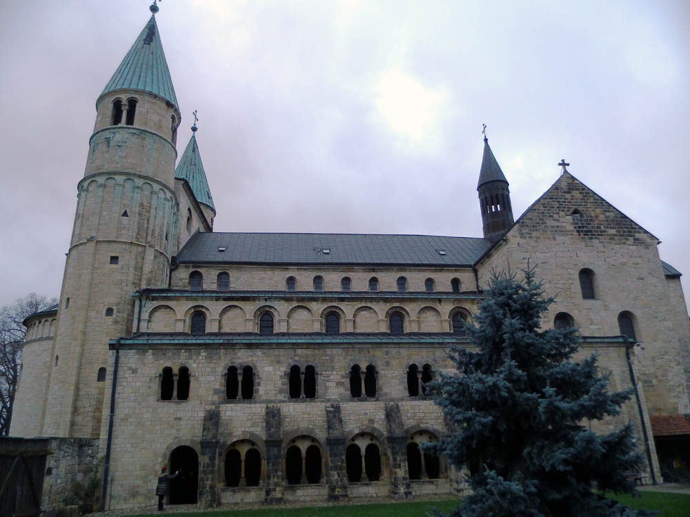 In der Vorhalle des sonst abgebrochenen Domes zu Goslar finden sich 6 Säulen museumsmäßig aufbewahrt, die aus der ehemaligen Domkrypta stammen. Ein Kapitäl davon ist ganz im Charakter der Kapitelle der Unterkirche von Quedlinburg gehalten und fällt durch seine eleganteren Formen auf vor den übrigen, von denen 2 ganz glatte Würfelkapitelle sind. Zwei auf allen 4 Seiten gleich ornamentierte Kapitelle haben genau solche rillenartigen Blattbildungen, und ebenso ein Kapitellbruchstück, das im Kaiserhause aufbewahrt wird, wie die eben beschriebenen in Gernrode. Da ferner unter den sechs Kapitellen, zu denen das Bruchstück im Kaiserhause als 7. hinzukommt, sich eins befindet, das außer den Blätterformen auch die beschriebenen Schließen zeigt, und da nicht bloß dieselbe Stilstufe vertreten ist, sondern die Ähnlichkeit so groß ist, daß derselbe Künstler die Kapitelle angefertigt haben muß, so können wir mit dem heiligen Grabe in Gernrode die Krypta des Domes in Goslar als gleichzeitig annehmen.