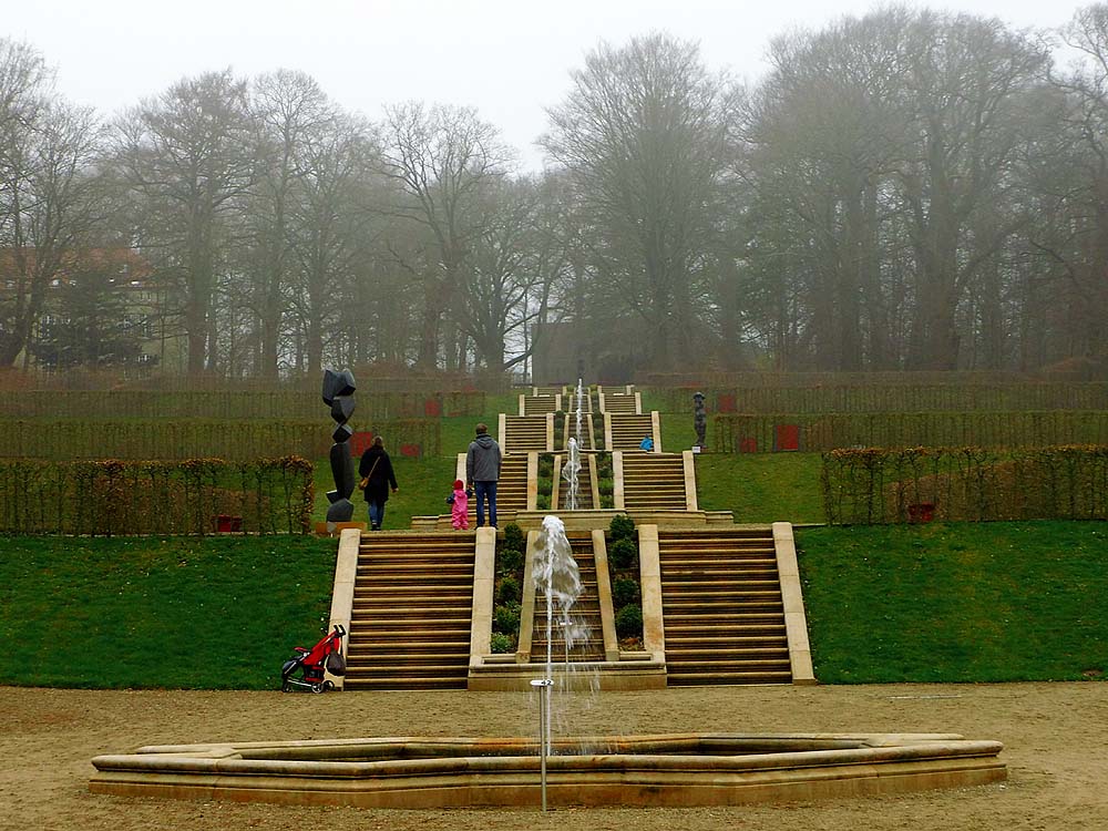 der Stadt Schleswig, welcher den Friedrichsberg mit dem Lollfuß verbindet; dieser Stadttheil heißt der große Damm, liegt südöstlich vom Schlosse und ist mit alten hohen Bäumen geschmückt. Eine hölzerne und eine steinerne Brücke verbinden die Schloß-Insel mit diesem Damm. Die nördliche Seite des Schlosses umgeben waldige Anhöhen, an denen hinauf sich der fürstliche Garten, Neuwerk genannt, zieht.