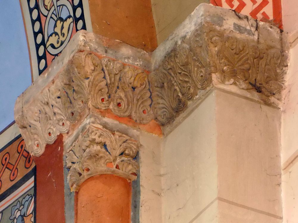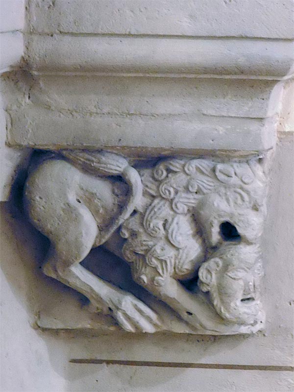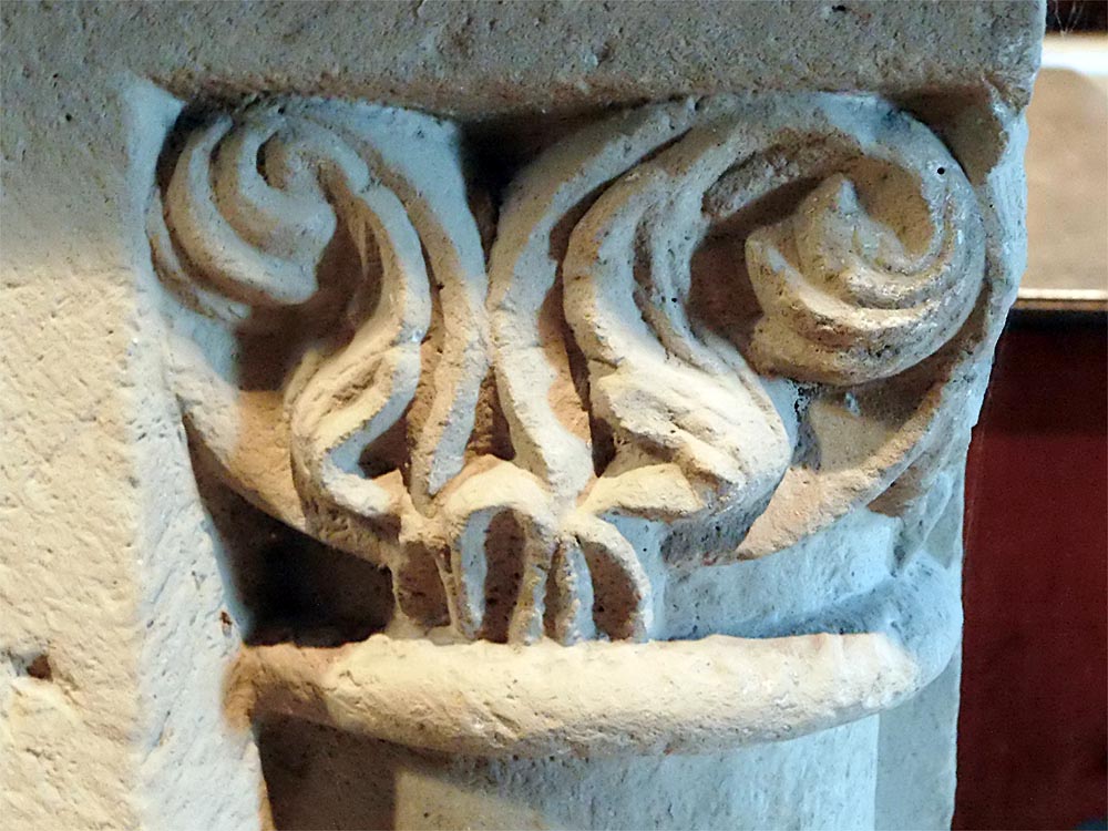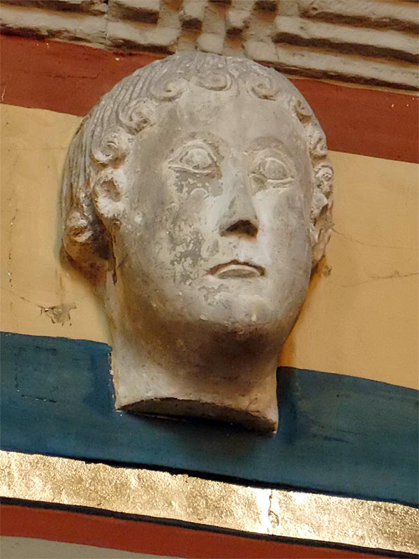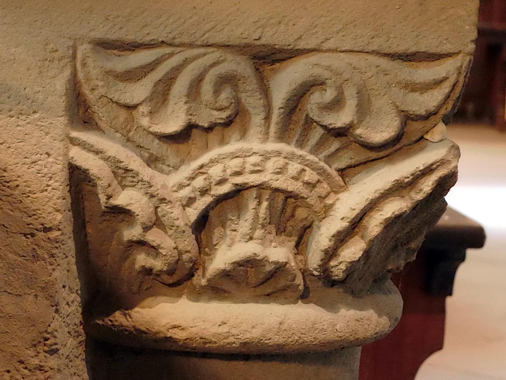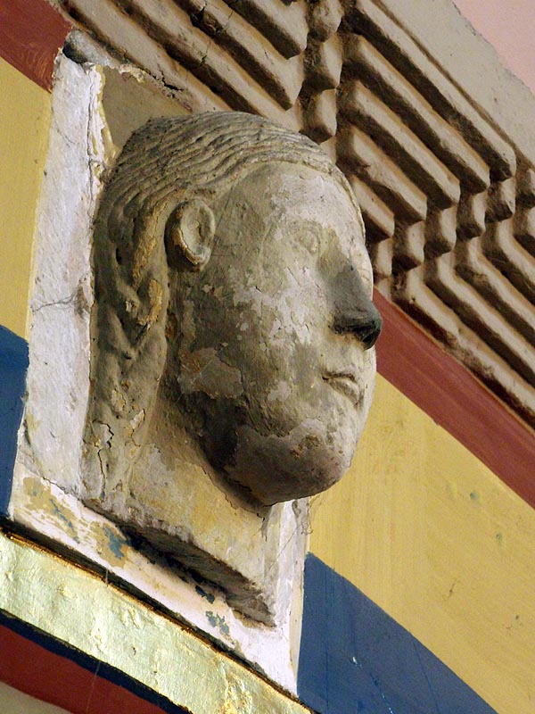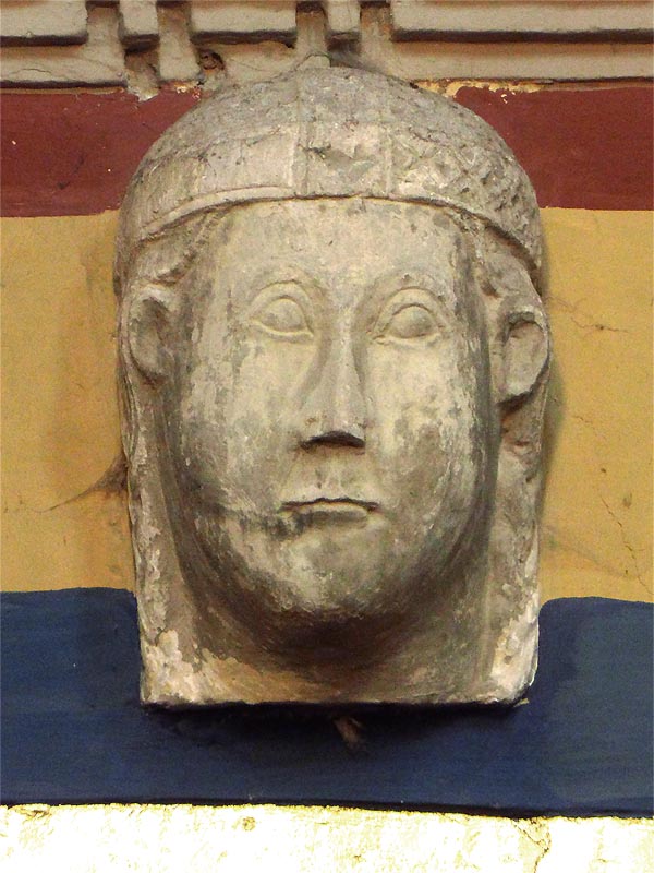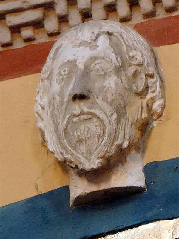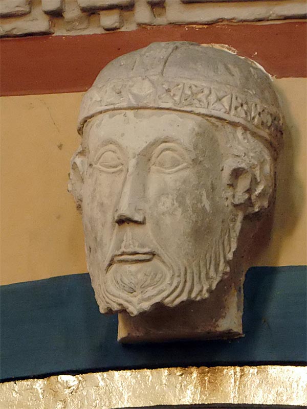 als besonderer die Bögen abschließender Schmuck gedacht sind“, was Windschild für möglich hält. Die Köpfe sind von Stein und sind Reste ganzer Figuren aus monumentaler Plastik. Das zeigen deutlich die verschieden laufenden, nicht geradlinigen Schnittflächen unter dem Kinn, wo man sie vom Körper abgemeißelt hat. Außerdem kennt die romanische Stein-Plastik keine Einzel- oder gar „Porträt“-Köpfe. Die Figuren, zu denen die Köpfe gehören, können nicht an dieser Wand, sie müssen an anderer Stelle gewesen sein.