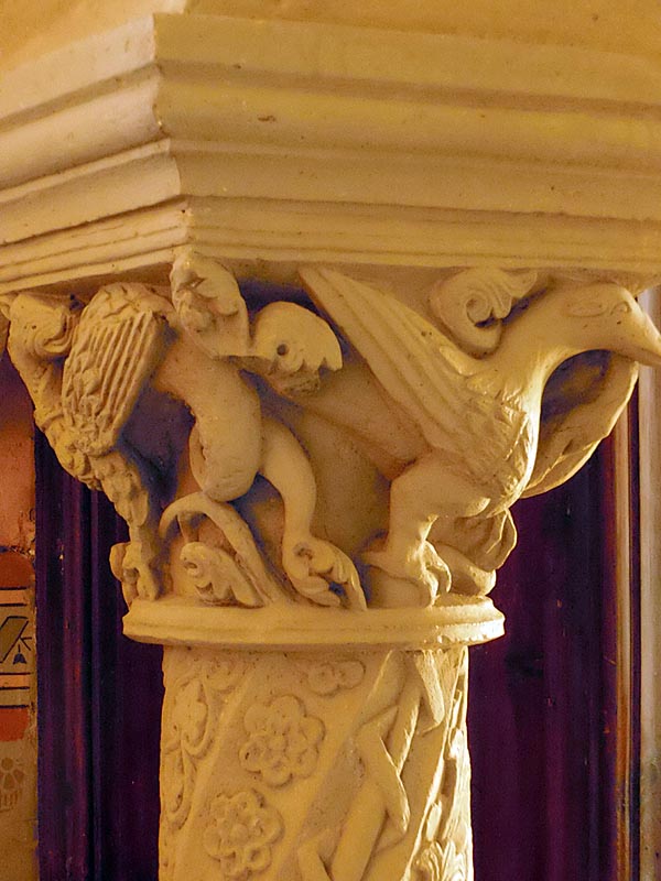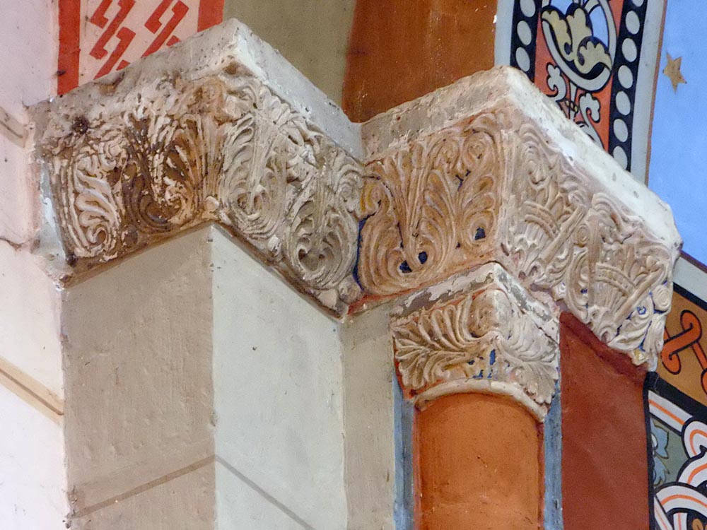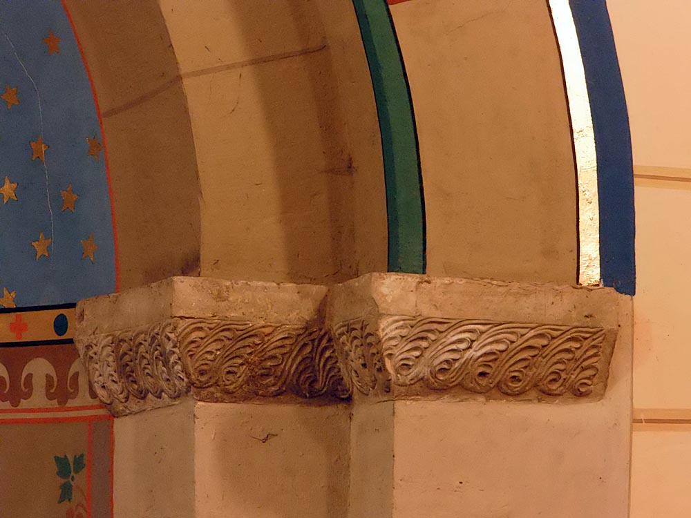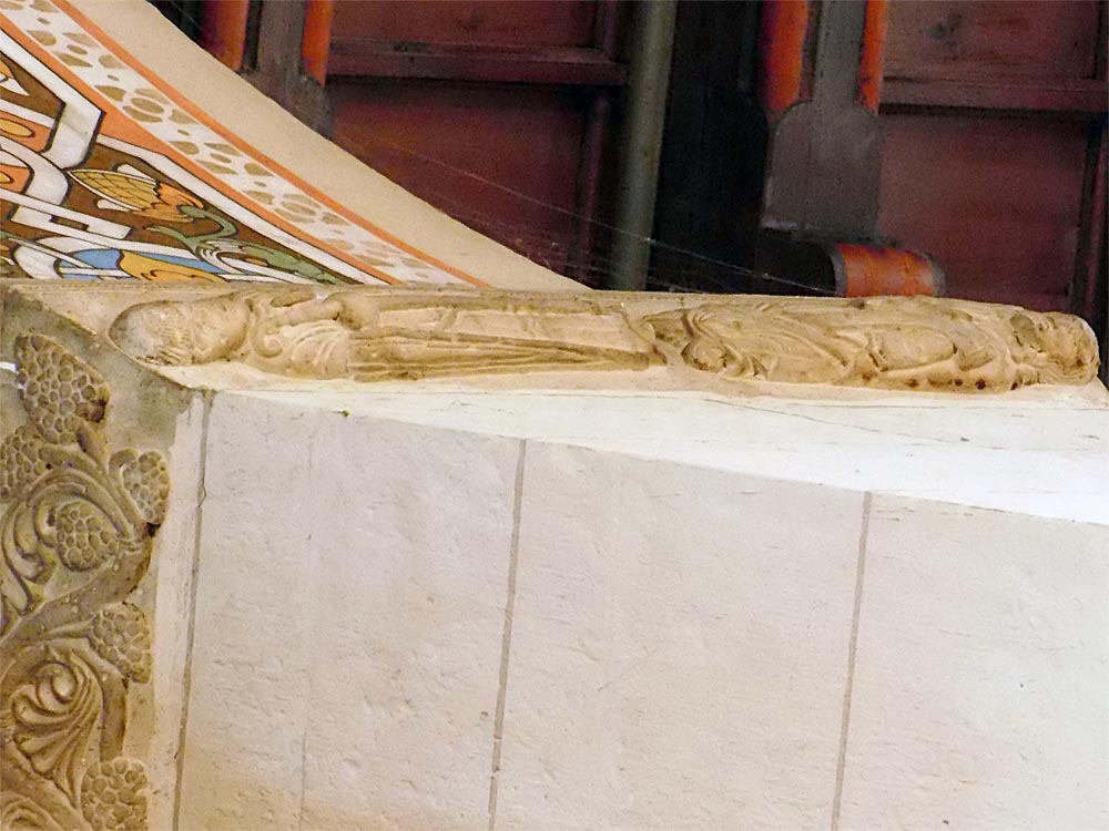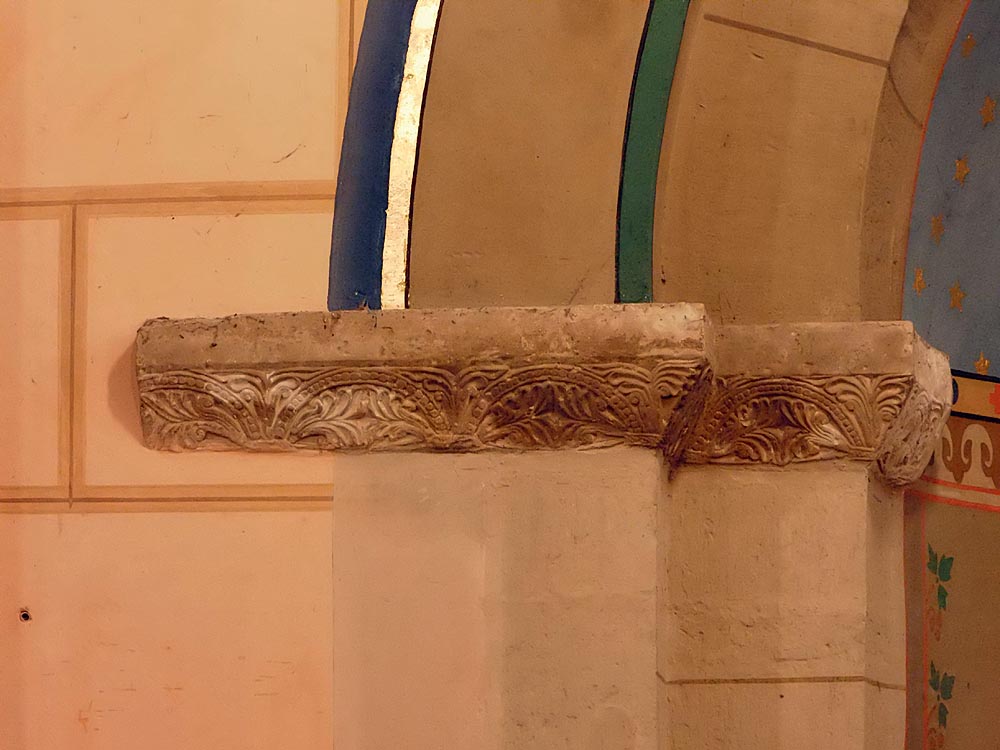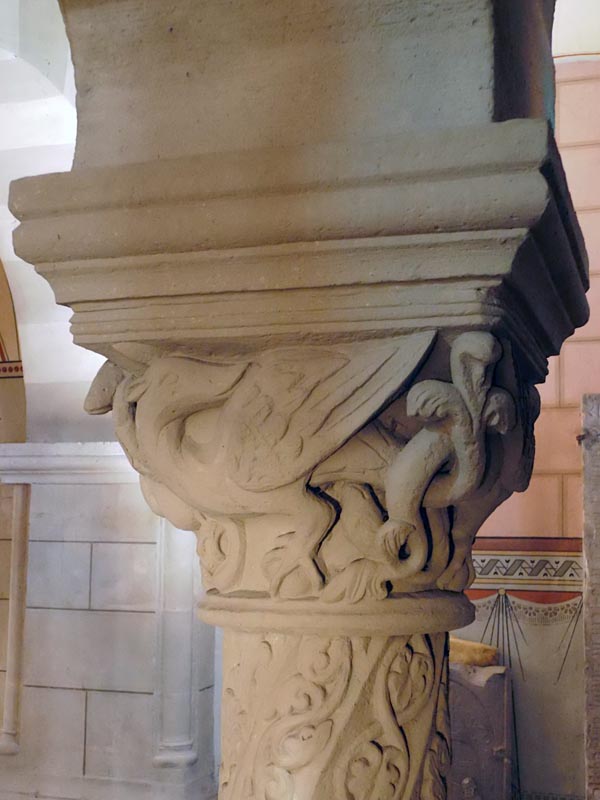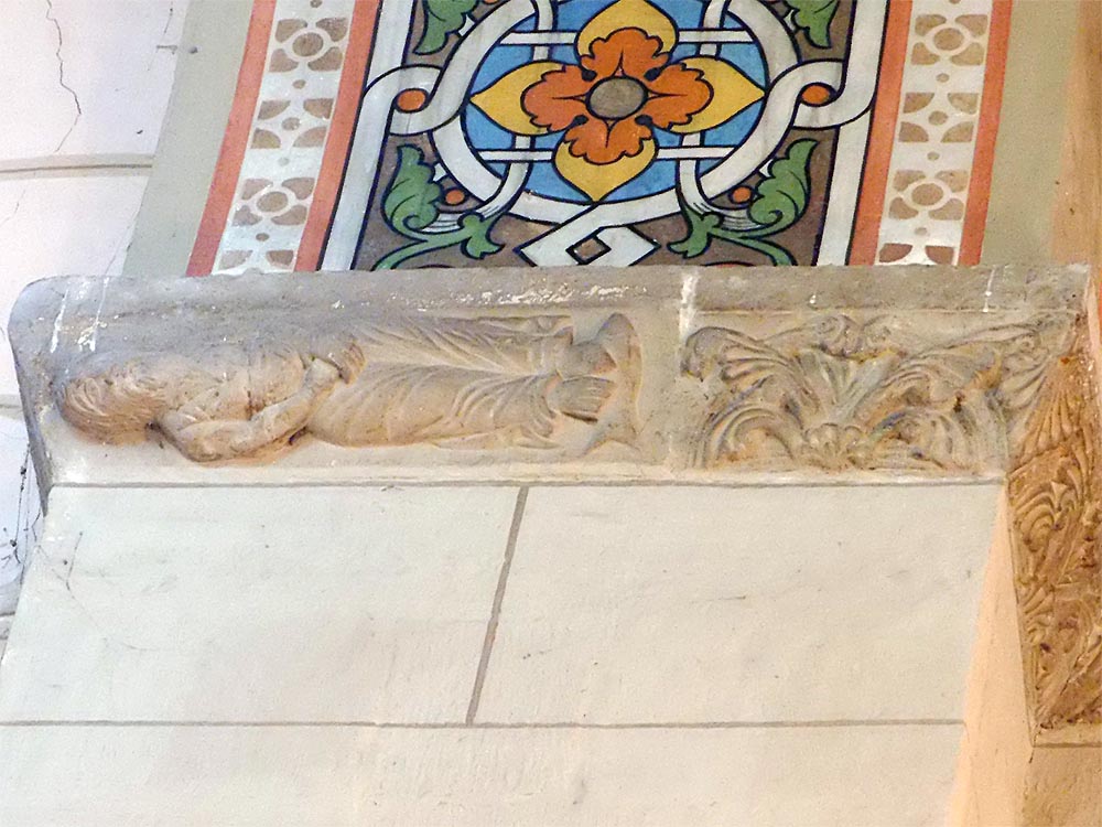 als besonderer die Bögen abschließender Schmuck gedacht sind“, was Windschild für möglich hält. Die Köpfe sind von Stein und sind Reste ganzer Figuren aus monumentaler Plastik. Das zeigen deutlich die verschieden laufenden, nicht geradlinigen Schnittflächen unter dem Kinn, wo man sie vom Körper abgemeißelt hat. Außerdem kennt die romanische Stein-Plastik keine Einzel- oder gar „Porträt“-Köpfe. Die Figuren, zu denen die Köpfe gehören, können nicht an dieser Wand, sie müssen an anderer Stelle gewesen sein.