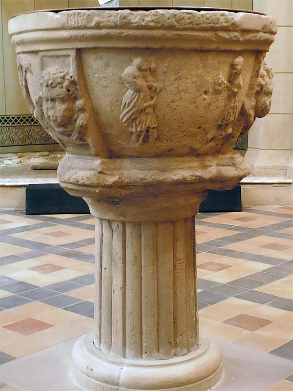 Büttner Pfänner zu Thal streift die Köpfe mit einer kurzen Notiz (S. 164): " Ferner befinden sich zwischen den Engeln über den nördlichen Arkadenbögen einige Köpfe romanischen Charakters. Dieselben haben vermutlich auch nicht hier gesessen, sondern sind vielleicht Grabsteinen entnommen, da sie Porträts zu sein scheinen. Es sind im ganzen fünf, wovon zwei einen Kronreif tragen. Auffallend klein sind die Ohren, die außerdem etwas zu hoch sitzen.