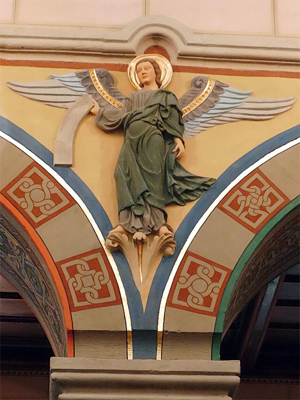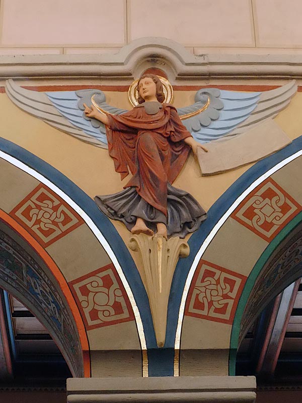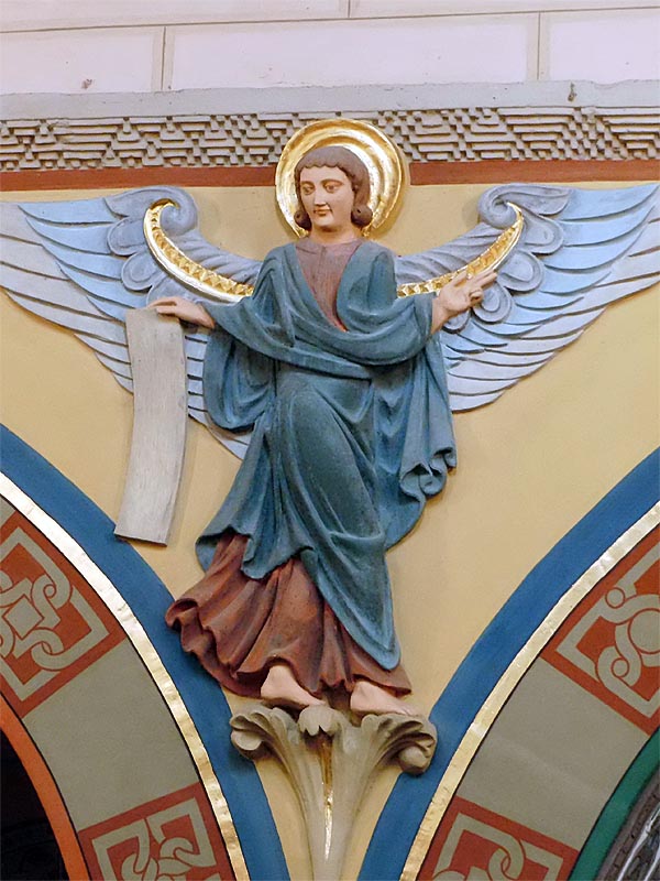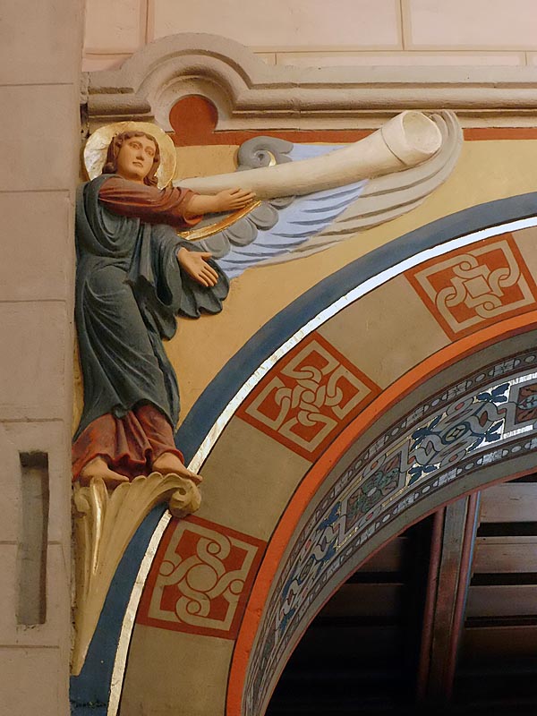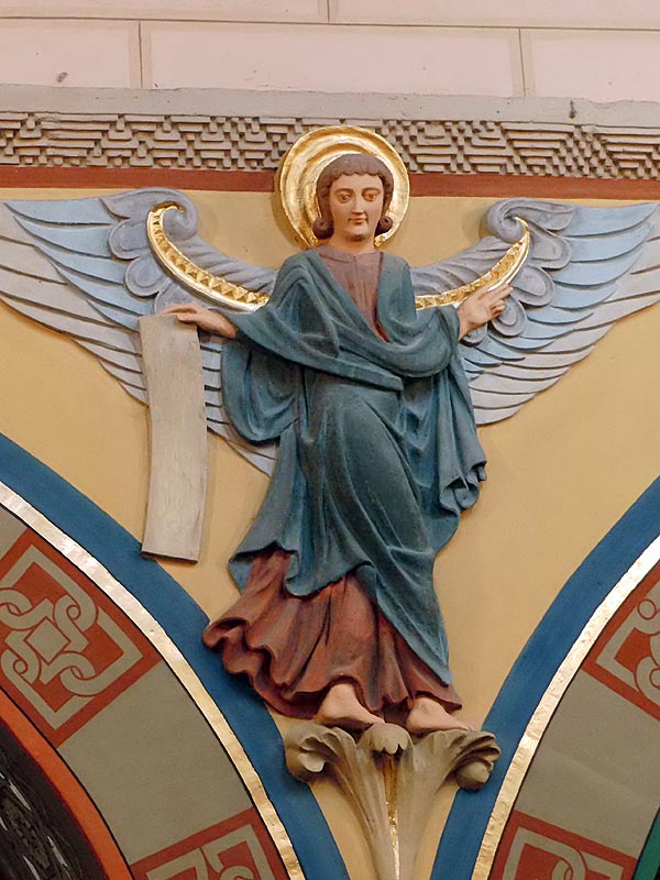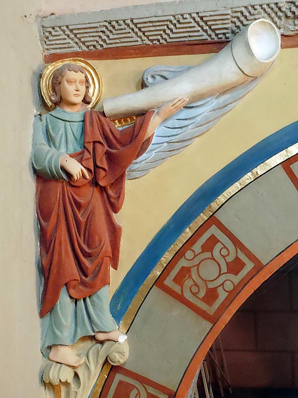 Dehio im Handbuch der deutschen Kunstdenkmäler spricht von „Männerköpfen“ neben den Engeln.