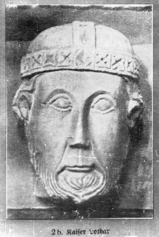 An den Wänden, aus dem Stein herausgearbeitet, stehen in feierlicher Haltung der Kaiser Lothar 19), die Kaiserin Richenza und Bildwerke der Verstorbenen mit den uns bekannten Köpfen. Die Körper dieser Gestalten müssen wir uns ähnlich dem Widukind in Enger vorstellen, vielleicht bereits von betonterer Körperlichkeit und Plastizität, aber von gleicher Starre und Vergeistigung.