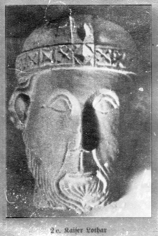 Ich habe Spinnweben und fingerdicken Staub von diesen Köpfen fegen müssen, als ich sie von der schwankenden Leiter photographierte, und möchte sie nun endgültig aus ihrem 800jährigen Dornröschenschlafe wecken 2). Ich bin der Überzeugung, daß wir in diesen Köpfen nicht nur 5 kostbare romanische Bildwerke besitzen, sondern daß wir hier steingewordene deutsche Kaisergeschichte aus der frühen Hohenstaufenzeit in aller Güte vor uns haben.