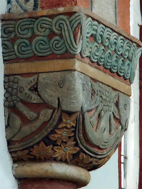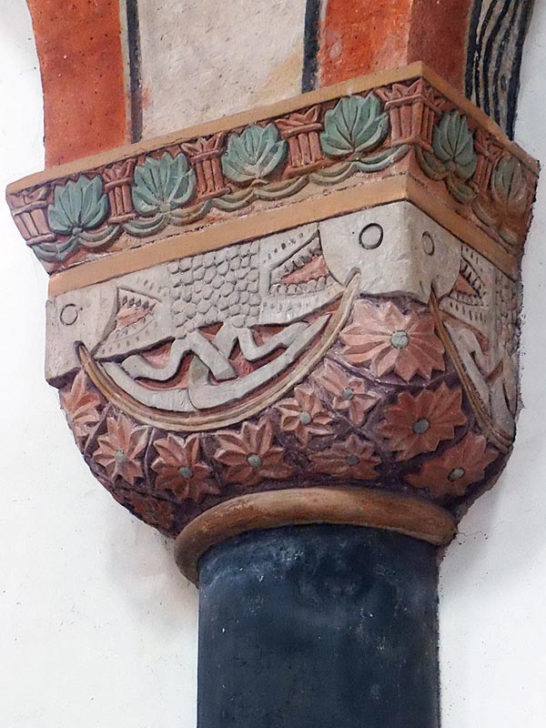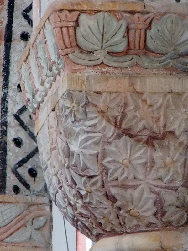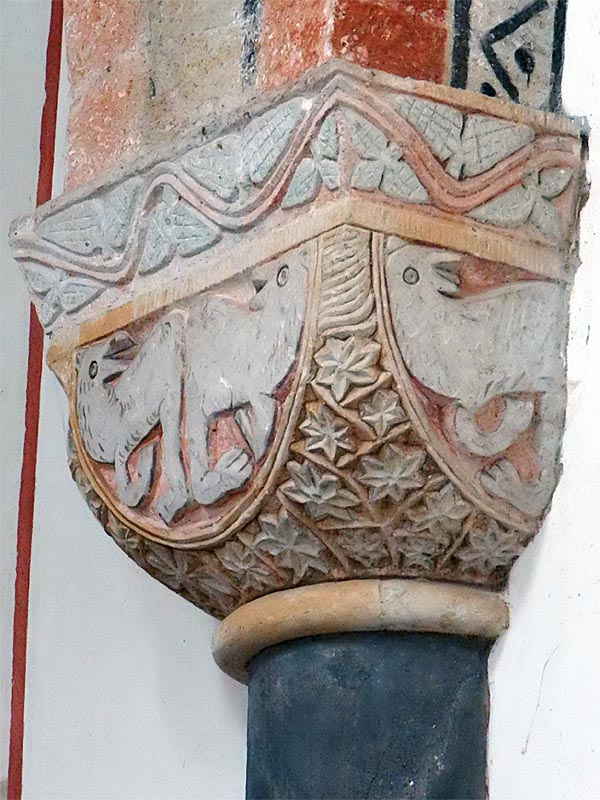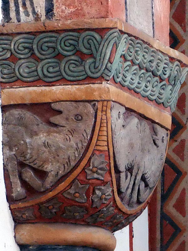theils mit andrer Rankenverzierung. Aehnliche Deckgesimse befinden sich auch als Kämpfer über sämmtlichen Pfeilern und Wandpfeilern der Kirche (nur der Kämpfer der ehemaligen Nische im südlichen Kreuzflügel zeigt eine gegliederte, aus Wulst und Hohlkehle bestehende Form), sowie auch das Gesims, welches über den Bogenstellungen hinläuft, dieselbe Form hat. Zumeist finden sich zur Verzierung dieser Gesimse rohe Bandverschlingungen angewandt, namentlich an dem Gesims über der südlichen Bogenstellung des Schiffes, wo sie nur an einer Stelle durch ein wunderlich gestaltetes Doppelkrokodill unterbrochen werden; das Gesims über der nördlichen Bogenstellung ist mit einem Rankenwerk verziert, welches mit Dreiblättern und Trauben versehen ist. Alle diese Verzierungen an Gesimsen und Kapitälen sind übrigens von sehr unsicherer und schwungloser Bildung und wiederum nur mehr als eine ausgemeisselte Zeichnung, denn als wirkliche, hervorspringende Reliefsculptur zu betrachten. Die fast fingerdicke Tünche, welche dieselben gegenwärtig bedeckt, macht ihre Bildung noch unförmlicher erscheinen, als sie es schon an sich ist. Wenn man die Tünche wegschabt, so bemerkt man allenthalben die, ohne Zweifel ursprünglichen Farben, mit denen diese Ornamente bemalt waren: Roth, Blau, Grün u. s. w.