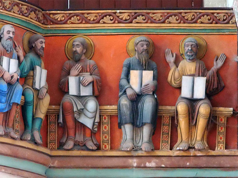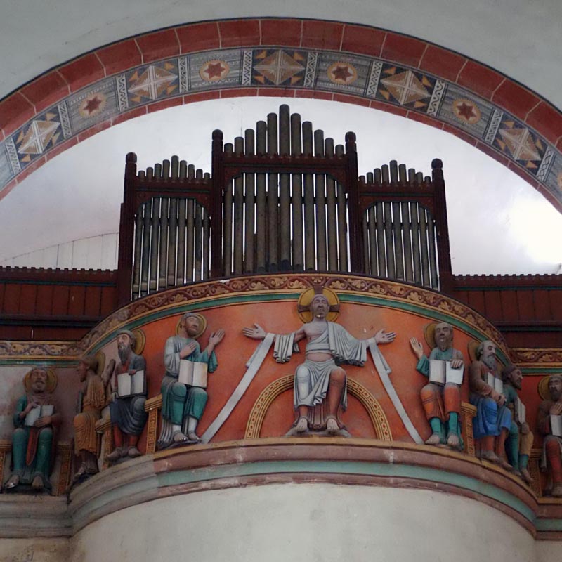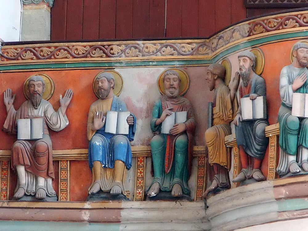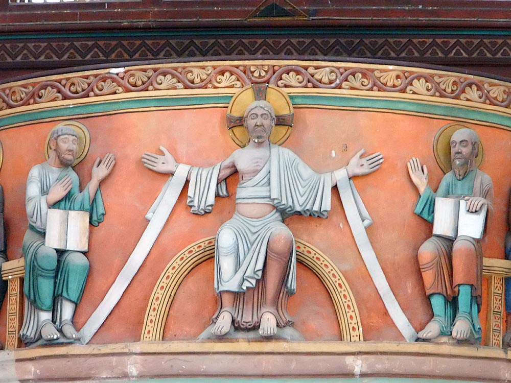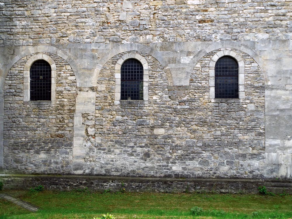 Fensterchen. Ein Tonnengewölbe, an welchem man Spuren von farbiger Verzierung bemerkt, überdeckt die Kapelle; die Altarnische ist, wie gewöhnlich, mit einer Halbkuppel überwölbt. Doch scheint dieser merkwürdige Einbau, außer als Gruftkirche, auch noch zu einem anderen Zwecke gedient zu haben: - etwa zu dem einer Kanzel oder eines Singechores für den in der Kirche selbst abzuhaltenden Gottesdienst. Sie hat nemlich oberwärts, über dem Tonnengewölbe, einen ebenen, horizontalen Boden, welcher sich auch über den halbrunden Ausbau der Altarnische (so daß deren Kuppelgewölbe im Aeußeren nicht sichtbar wird) erstreckt und welcher von einer hohen steinernen Brüstung, die sich somit auch um den genannten Ausbau herumzieht, eingefaßt wird. Diese Brüstung ist auswärts mit großen, in Stuck gearbeiteten Relieffiguren geschmückt, welche Christus und die zwölf Apostel darstellen. Christus sitzt in der Mitte auf dem Regenbogen, die Hände ausgebreitet, über jeden Arm ein lang herabhängendes Spruchband. Zu seinen Seiten sitzen die Jünger auf Bänken, mit Büchern in der Hand, je drei an dem halbrunden Ausbau, die übrigen an den geraden Wänden. Sämmtliche Figuren sind in dem etwas kurzen, schweren, sehr massigen Style gebildet, welchen die deutsche Seulptur um den Anfang des zwölften Jahrhunderts aufweist, und dürften demnach ungefähr diese Zeit als die Periode, in welcher der Einbau ausgeführt worden, bestimmen; sie sind noch ungeschickt, in der Gewandung noch streng stylisirt, aber ohne die Anzeichen jener Verkrüppelungen, welche in der früheren Zeit des elften Jahrhunderts so häufig gefunden werden, und auch nicht ohne ein gutes Gefühl in der Anordnung des Gefältes. Unter der Tünche, womit sie gegenwärtig überstrichen sind, zeigen sich auch an ihnen die deutlichsten Farbenspuren. Leider sind diese Figuren nicht von Beschädigungen frei geblieben; einigen sind die Köpfe abgehauen, und zwei von ihnen fehlen ganz, indem man die Brüstung durchbrochen hat, um solcher Gestalt eine Verbindung des Raumes über der Kapelle mit dem schlechten Orgelchor, welcher gegenwärtig diesen gesammten Einbau verdeckt, zu gewinnen. Unterwärts ist die Brüstung von einer Art attischen Basamentes begränzt, oberwärts