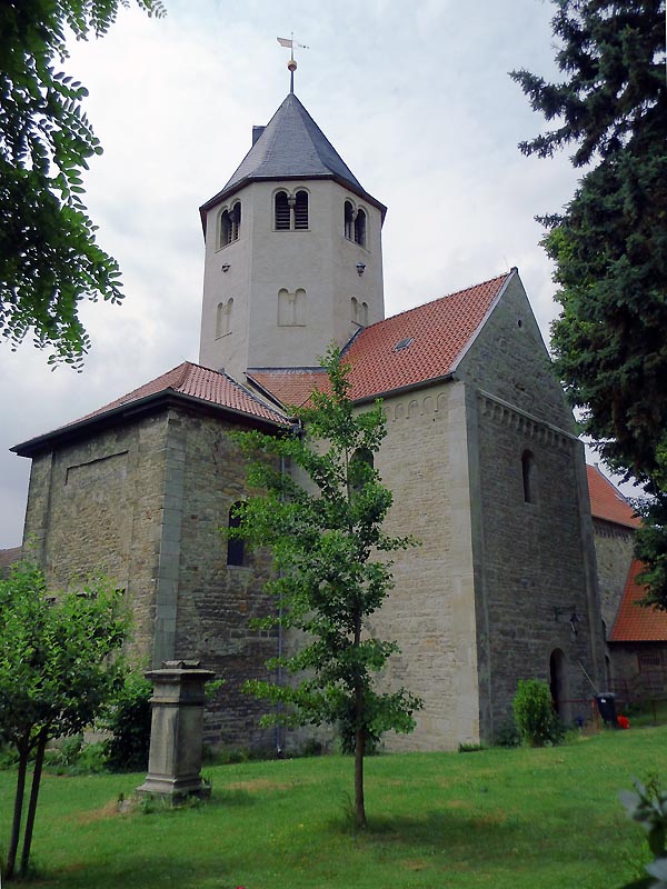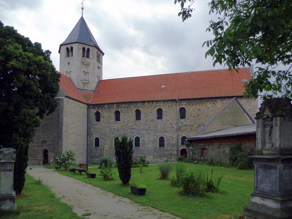 Stiftungs-Urkunde vom 26. Mai des Jahres 936, durch welche Graf Siegfried dem Convente von Corvey zur Errichtung eines Klosters übergiebt: "hereditatem suam in pago Hardgo, in loco cujus vocabulum est Westergroningen sito juxta fluvium Bade: hoc est ipsam ecclesiam cum clericis, quos ibi proprios habuit etc." Das Kloster von Westergröningen blieb, die Zeit seines Bestehens hindurch, dem Stifte von Corvey zugehörig; weitere Nachrichten über die Geschichte desselben sind nicht bekannt *). Ob die gegenwärtig vorhandene Kirche die in jener Urkunde angeführte sein möge, muß natürlich, in Ermangelung anderweitiger Zeugnisse, zweifelhaft sein; indeß zeigt sie in den erhaltenen Theilen ihrer ursprünglichen