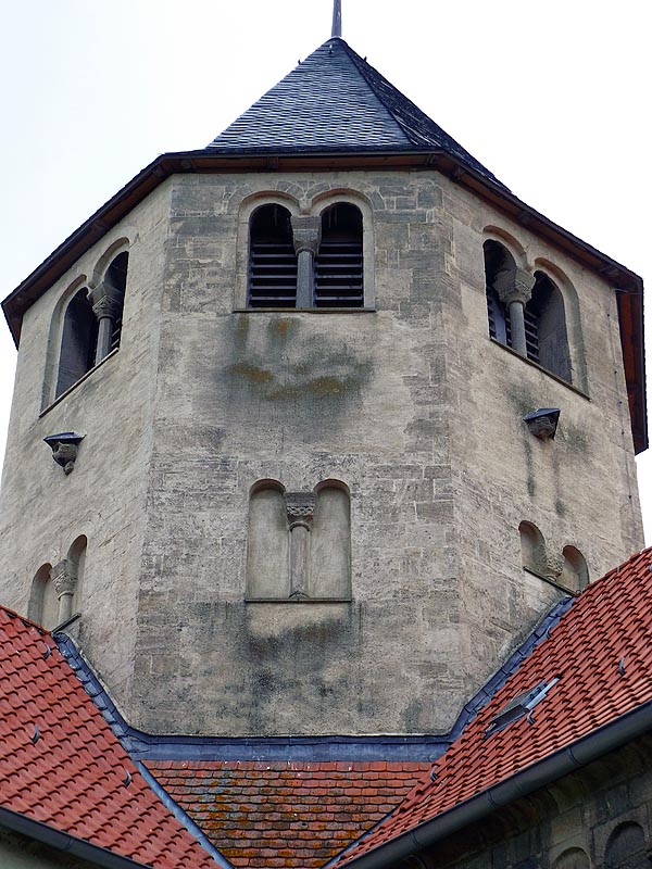 Anlage, die durch die späteren Unbilden und Veränderungen, welche sie erlitten hat, nicht gänzlich vernichtet ist, mannigfache Motive, welche wenigstens an sich bereits auf ein beträchtlich hohes Alter zurückdeuten. Zu bemerken ist, daß die Details dieser ursprünglichen Anlage den roheren Theilen der Schloßkirche von Quedlinburg verwandt und einige der vorzüglichst charakteristischen Ornamente beiden gemein sind.