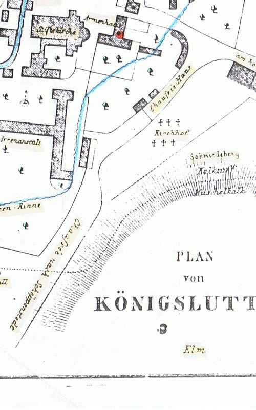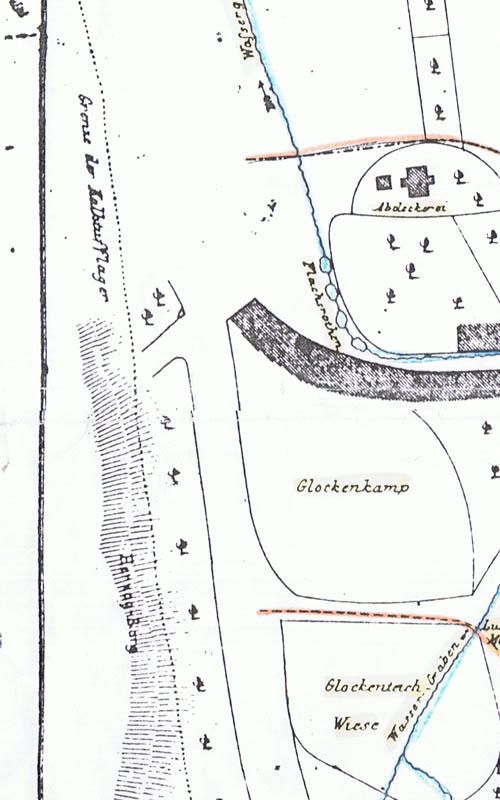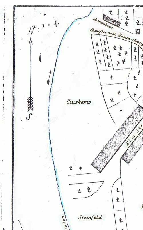 1) Siehe den beiliegenden skizzirten Plan (Tafel VIII.) Die Irrenanstalt, die Häuser am hohlen Wege, im Norden des Glockencamps, an der Dragonerkuhle, im Norden der Fallersleberstrasse und die ganze Elmstrasse waren im Jahre 1850 noch nicht gebaut.