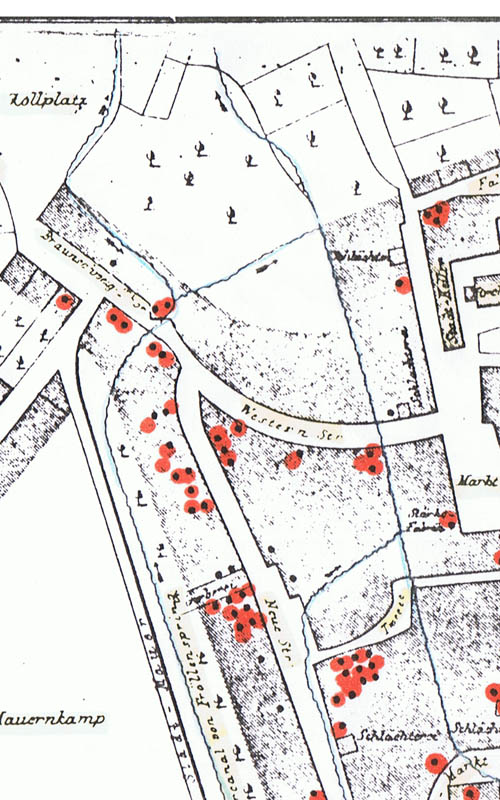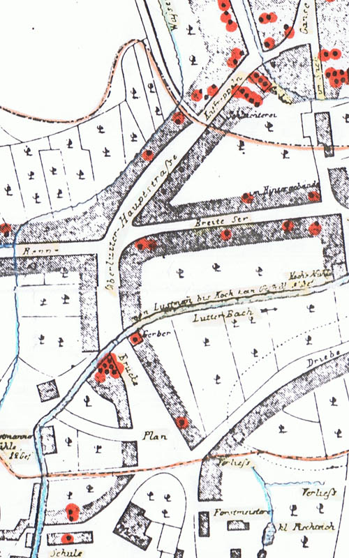 Plan von Königslutter mit Cholera-Todesfällen im Jahr 1850 (Kolorierung durch Heinrich Medefind)