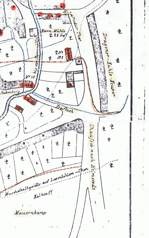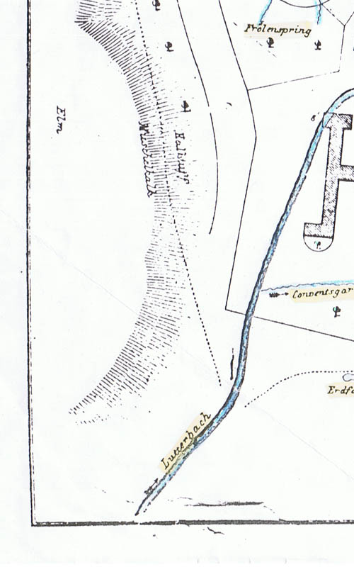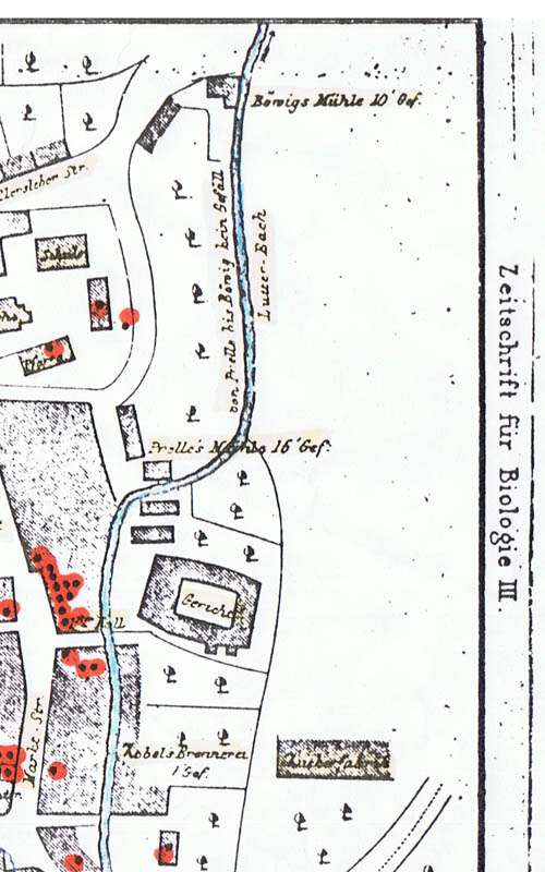Aus diesen Zahlen ist ersichtlich, dass die Lutter fast nur bei den Mühlen Gefäll hat, und dass sie an vielen Stellen, namentlich vor den Mühlen höher gehalten ist, als die dem gleichmässigeren Abfallen des Bodens sich anschliessenden Sohlen der benachbarten Häuser. Die übrigen kleineren Wasserleitungen, welche den Ort durchziehen, bestehen in l-2' breiten offenen Canälen, welche bei vermehrtem Wasserzuflusse leicht übertreten und auch nicht überall