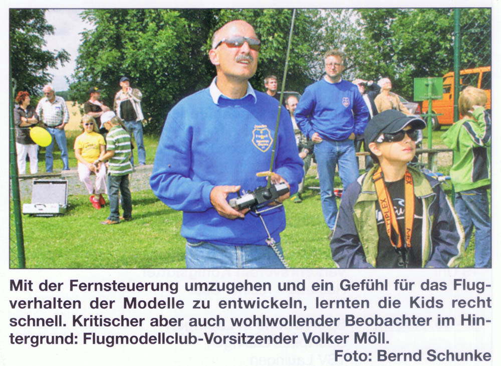 Unter Anleitung, wie vorgeschrieben mit Sonnenbrille und Schirmmütze, hatten die Kinder die Möglichkeit, selbst einmal eines der Modelle in die Luft zu bringen und fernzusteuern. Bedauerlicherweise machte ein heftiger Regenguss diesem Vergnügen schnell ein Ende. Die Stimmung blieb jedoch gut, denn der „theoretische Unterricht” und das Gesellige waren dadurch intensiver. Der Verein ist mit rund 70 Mitgliedern gut aufgestellt. Besonders erfreulich ist, dass davon zehn zum Nachwuchsbereich zu zählen sind.