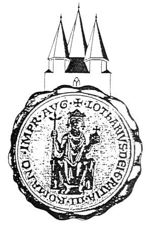 Einige Darstellungen damaliger Thronsitze sowie zum Pfalzenproblem und über das Gastungs- und Herbergsrecht mittelalterlicherHerrscher bestätigen das.Weitere Bestätigungen über die Aktivitäten Kaiser Lothars werdenin dezent beleuchteten Tischvitrinen gezeigt: Urkunden in Originalen und Kopien mit ihren Übersetzungen.Zwei seiner Urkunden wurden in "Lutere" bzw. "Luttera" verfaßt.Selbstverständlich liegt auch eine Kopie der Gründungsurkunde fürdas Benediktinerkloster in "Luttera" hier unter Glas. Das Originalging leider verloren.Besonders interessant sind die Nachrichten der Magdeburger undPaderborner Annalen über den Friedenstag von Pfingsten 1135, woder im März in Bamberg von Lothar verkündete Landfriede von densächsischen Fürsten, dem Herzog von Böhmen, den Gesandten der Könige von Dänemark und Ungarn und des Herzogs von Polen beschworenwurde. Im Jubiläumsjahr 1985 fällt Pfingsten ebenfalls auf den26. Mai wie damals.Die Aktivitäten des Kaisers allein in diesem Zeitraum vom Märzbis zum August 1135 gedanklich nachzuvollziehen, bietet eine wichtige Grundlage für das Verständnis des Geistes und der Umstände,die zum Bau seiner Grabeskirche führten, läßt seine enorme Leistungsfähigkeit und den auf ihn einwirkenden komplexen Leistungsdruck erkennen und führte die Forschung vielleicht zu weiterenErkenntnissen.Auch die 1620 und 1978 gefundenen Grabbeigaben werden, auf Samtgebettet, in drei Vitrinen dem Betrachter präsentiert: die Bleiplatte mit den Regierungsdaten des Kaisers, sein Szepter, dieRinge mit der rätselhaften Inschrift und die Krone der Kaiserin.