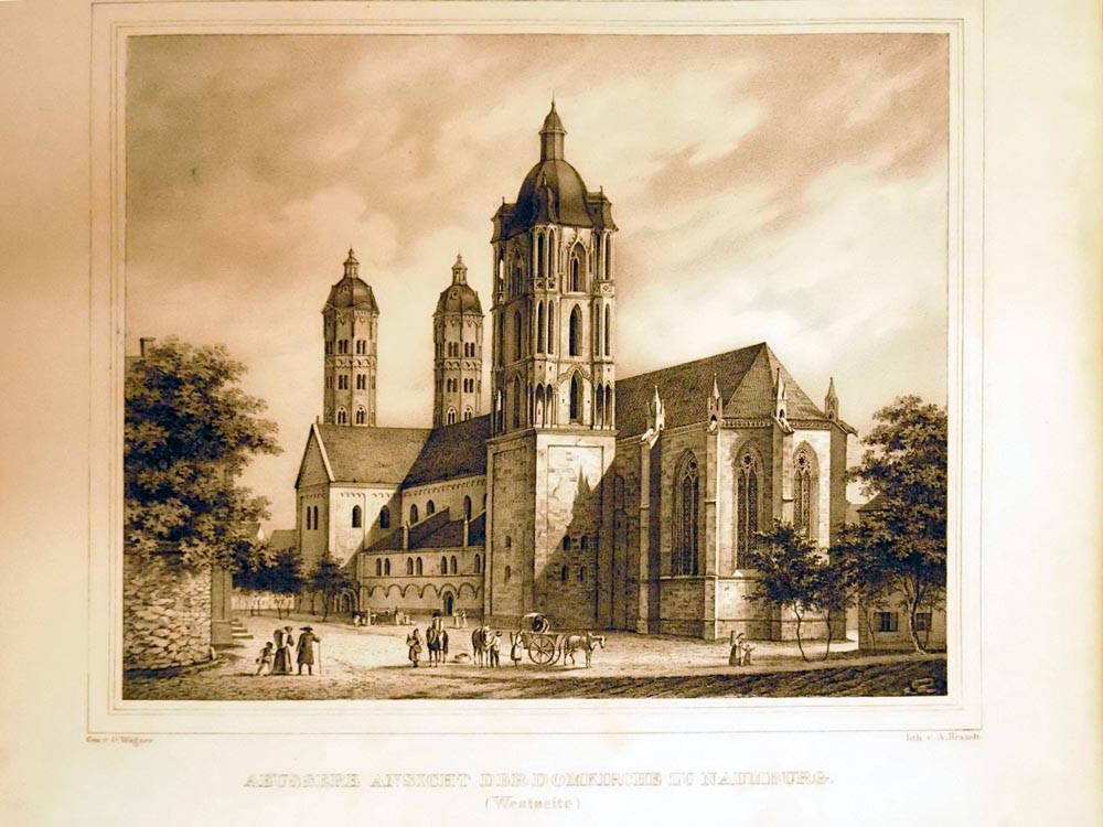 Zu den interessantesten Denkmalen altdeutscher Baukunst gehört der Dom zu Naumburg, nicht nur um deswillen, weil wir hier in den verschiedenen und zu verschiedenen Zeiten entstandenen Theilen des Gebäudes, neben den vorherrschenden Ueberresten des neugriechischen, oder römisch-deutschen Styls, die Uebergänge zu der spätern reindeutschen Bauart, und diese schon in einem gewissen Grad der Ausbildung erblicken, sondern auch wegen verschiedener bemerkenswerther Eigenthümlichkeiten in der Anlage und Bauart, wodurch dieses Kirchengebäude sich von andern unterscheidet. Dahin gehört der westlich angebaute Chor, mit seinen merkwürdigen Statuen, welche nicht nur wegen ihrer geschichtlichen Beziehung, sondern auch als Ueberreste altdeutscher Steinbildnerei zu den beachtenswerthesten Kunstdenkmalen aus der Zeit ihrer Verfertigung zu zählen sind.