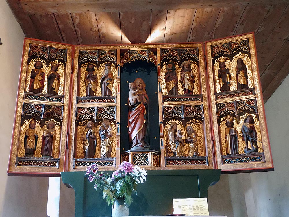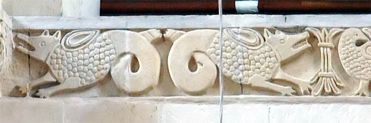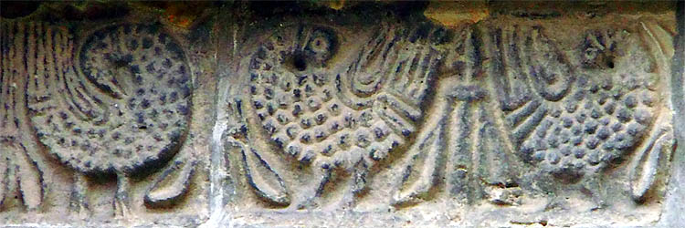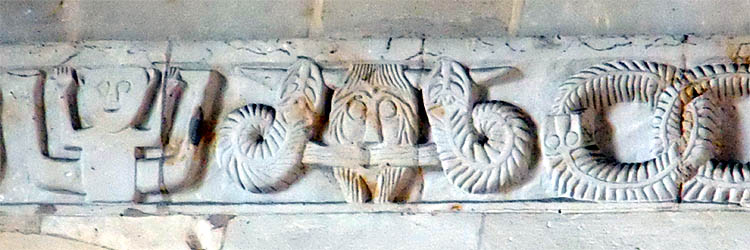 d) auf dem offenen Buch Christi: Venite bened[icti] patri[s] mei 4) In den Zwickeln des Kleeblattbogens kreuzgeschmücktes Α und Ω. Worttrennung durch Punkte, teils auf der unteren Linie, teils in halber Buchstabenhöhe. - Kräftige Majuskeln. Neigung zu leicht geschwungener Erweiterung der Schaftenden, zum Teil (B, L) vollständige Biegung des Hauptschaftes zur Kurve. Beim A, dessen oberer Abschluss horizontal, teils gerade Schäfte, teils Schwingung des ersten, in einem Falle auch des zweiten Schaftes Uncialen: D, E (K:U = 7:4), M (bevorzugt die symmetrische Uncialform mit festem Mittelschaft, in einem Fall auch die andere Form, die die beiden