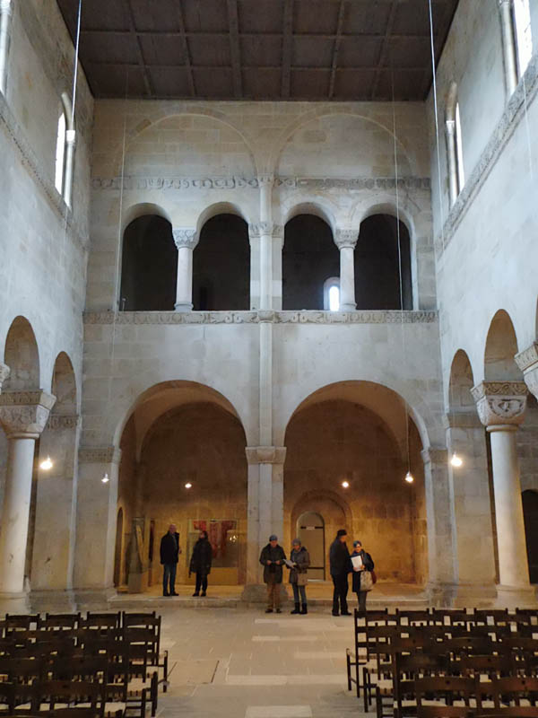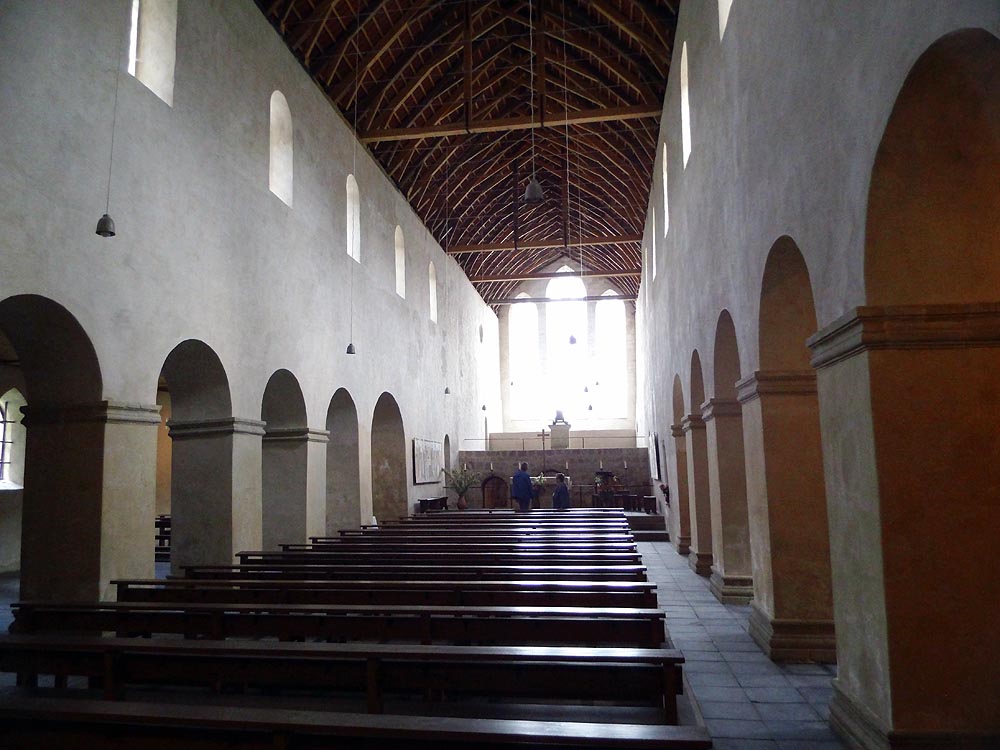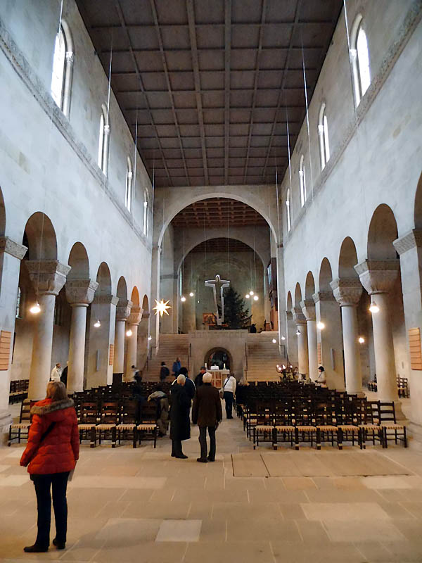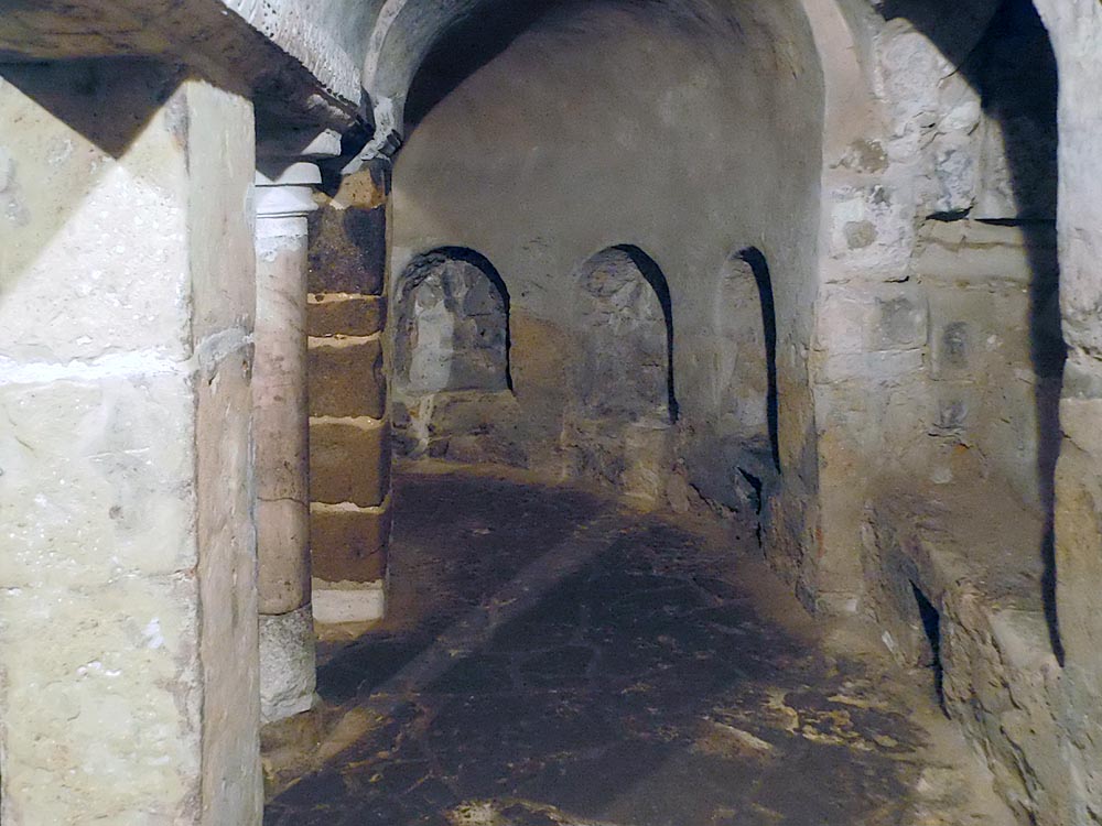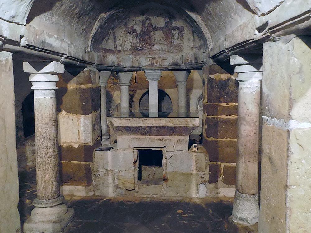 Von höchstem Interesse ist die kleine Gruftkirche dieser Kirche, der gegenwärtig sogenannte Altarkeller (S. d. Grundriß Taf. VI, 1.). Ihre ganze Einrichtung, sowie die Formation ihrer Details, läßt hier auf den ersten Blick das höchste Alter erkennen. Sie besteht aus einem kleinen Mittelschiff und fast eben so breiten Seitenschiffen, welche durch eine Stellung von je zwei Säulen und einem schweren viereckigen Pfeiler zwischen ihnen voneinander gesondert werden. An das Mittelschiff schließt sich, wie gewöhnlich, die Altarnische an, welche hier jedoch nicht durch Mauern, sondern ebenfalls durch eine Stellung von Pfeilern und Säulen (an den Ecken zwei schwere viereckige