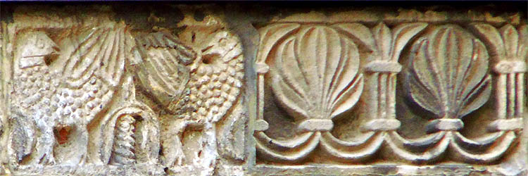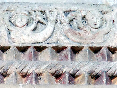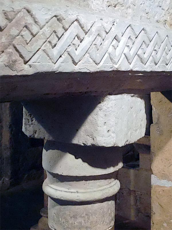 Form. Die Säulchen zu den Seiten desselben sind mit einem höchst einfachen Kapitäl versehen, welches die später ausgebildete Form des abgestumpften Würfels vorzudeuten scheint (3.); es bildet nur einen rohen Uebergang aus der runden Form der Säule in die viereckige Form des Abakus. (Dieselbe Form findet sich häufig, wenn auch reicher ornamentirt, an den ältesten Kirchen des Mittelalters, wie z. B. vorherrschend an den Säulenkapitälen von S. Vitale zu Ravenna, von S. Marco zu Venedig u. s. w.) Die Basen derselben (6.) sind ebenfalls attisch, aber mit starken vortretenden Pfühlen und kleiner eingezogener Kehle. - Die Säulenkapitäle