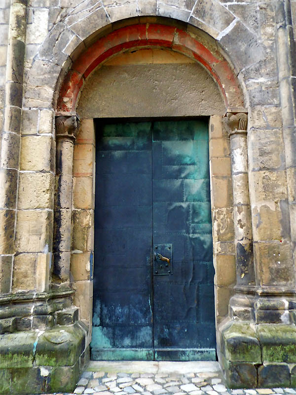 Das früheste Beispiel einer Grabfigur in Sachsen befindet sich auf der Bronzeplatte 1), welche die Ruhestätte des Gegenkönigs Rudolf von Schwaben († 1080) in der Vierung 2) des Merseburger Domes schmückt.