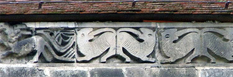 geschmückt; über derselben erhob sich ein Kruzifix, an der rechten Seitenwand aber befand sich ein zweites Bildnis des Verstorbenen in der Haltung, wie er die Messe zu lesen pflegte, mit zwei assistierenden Diakonen. - Wenn bei diesen Bildwerken der Einwand möglich wäre, dass sie nicht rein sepulkralen Charakter hätten, sondern den Bischof, obwohl sie sicher vor seiner Kanonisation (1134) entstanden, bereits als Heiligen auffassten, so fällt dieses Bedenken fort bei den in derselben Kirche begrabenen Edlen des 11. Jahrhunderts 1), über deren Gräbern ihre Bilder auf die Wand gemalt waren; die beigefügten Inschriften lassen keinen Zweifel über die Zusammengehörigkeit von Bild und Grab.