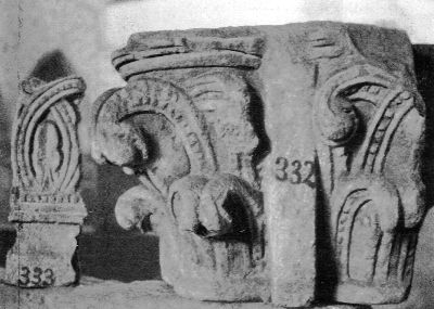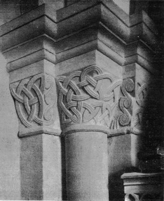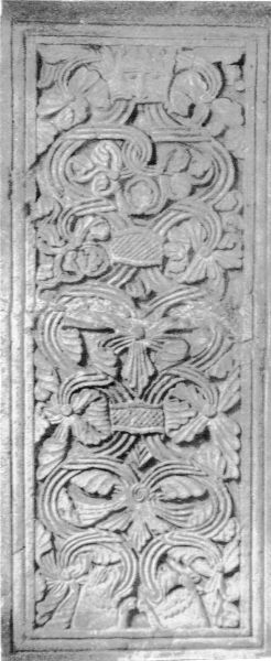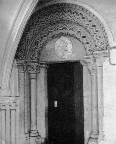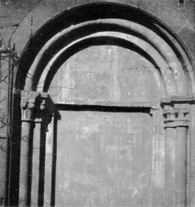 Noch merkwürdiger wird dieser ältere Bautheil aber durch drei Bildwerke, welche die Fronten der Pfeiler zur Seite der Nische und zwischen denselben schmücken. Sie sind innerhalb einer mehr hohen als breiten viereckigen Einfassung angebracht, deren einfache Profilirung den schon bezeichneten Charakter des älteren Bautheiles trägt. Die Oberkante der Reliefs liegt in der Höhe der Kämpfergesimse der Nischen, doch berühren sie dieselben nicht. Der gemessene Raum, in dem die Reliefs angebracht sind, der zu den Seiten nur einen schmalen Wandstreifen übrig lässt und sich völlig den gegebenen Grössen einordnet, lässt nur eine gleichzeitige Einfügung annehmen, da-