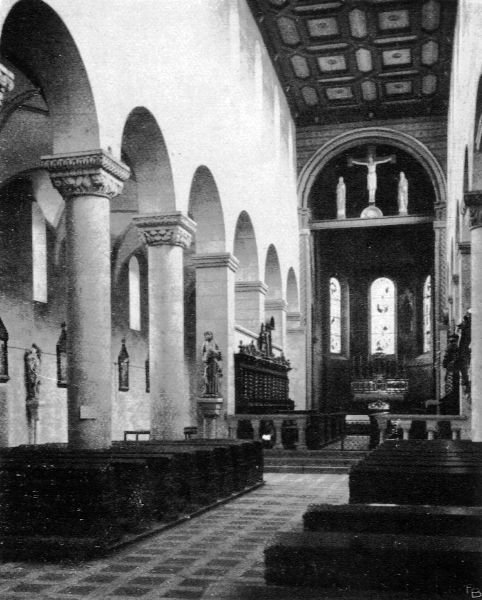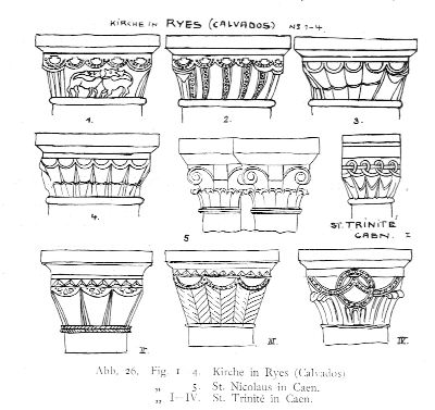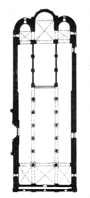 Grundform , nämlich ein Rechteck von doppelter Quadratform des Grundrisses, jedes Quadrat mit rundbogigem Kreuzgewölbe ohne Grate überspannt und durch schlanke Wandpfeiler von einander getrennt; jede Seite eines jeden Quadrats wieder von je zwei hohen Rundbogen - Nischen eingenommen, zwischen denen und zu deren Seiten sich wieder schmale und schlanke Pilaster befinden. Nicht minder ungewöhnlich erscheint auch das nur sparsam angewendete Detail, namentlich das elegante Profil aller Pilasterkapitäle und die ganz gleiche Basenbildung, welche eine der pragmatischen Ausbildung der romanischen Baukunst entschieden vorangehende Bildung zeigen.