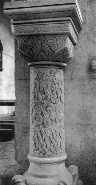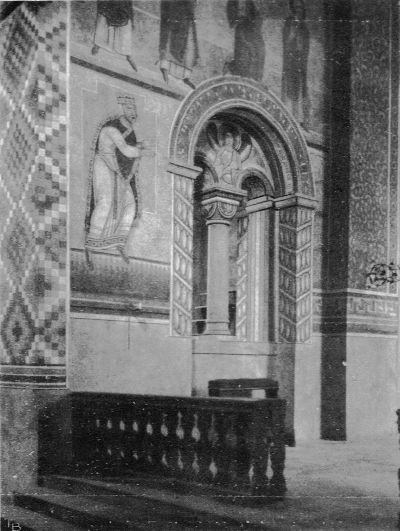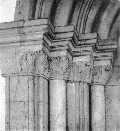 Am meisten erkennt man die spätere Zeit aber an zwei Pilastern der östlichen Nische und an dem je mittleren der Seitenabsiden. Die Anordnung ist so getroffen, das die das Innere erhellenden Fenster (was diese vier Schlitze doch nur wenig thun, da das Hauptlicht durch die acht grösseren Fenster der Kuppel hereinfällt) gerade stets auf einen der genannten Pilaster treffen. Derselbe ist nun an seinem oberen Theile, hart unter dem Kapitäle, um dieses schmalen Rundbogenfensters willen, dessen äusserer Kontur ungefähr dieselbe Breite hat, wie der Pilaster selbst, mit einer Einfassung umher, verkröpft und diese Verkröpfung als eigner Körper behandelt, mit besonderen Ober- und Untergesimsen versehen, die, im Charakter der übrigen gehalten, mit diesen sich nur noch zusammengruppiren und der ganzen Anordnung eine sehr bunte Erscheinung geben, die einer ursprünglichen Architektur, wie sie das XI. Jahrhundert und noch mehr die vorhergehenden charakterisirt, sehr wenig entspricht, wohl aber dem XII. Jahrhundert.