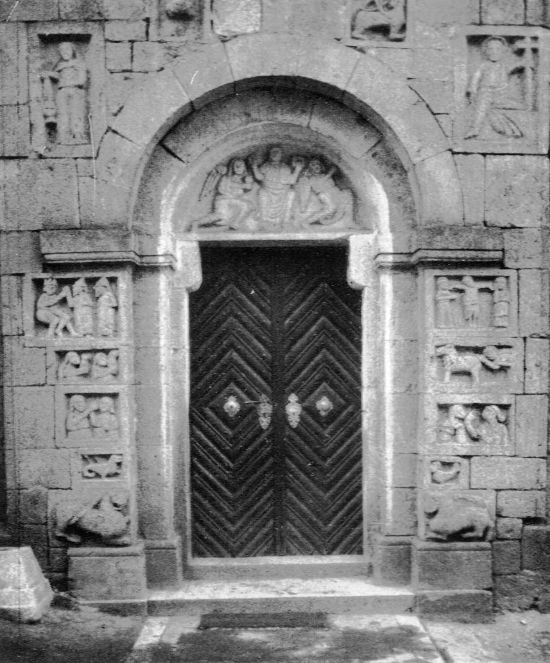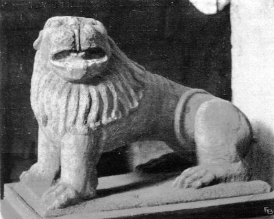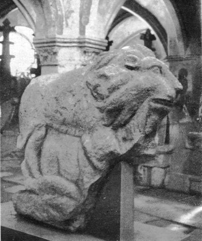 Die zu beiden Seiten des Portals und in der Mitte der seitlichen Wandflächen auf Postamenten ruhenden Löwenfiguren lassen sehr vermuten, dass ihre Anbringung an diesen Stellen trotz der äusserst meisterhaften Einfügung nicht ursprünglich war. Man kann vielmehr das Hineinstossen der Tierleiber in die menschlichen Figuren befremdend finden und mit Recht von der Ansicht ausgehen, dass diese Anordnung die Folge einer späteren Einfügung ist. Die Mönche werden sich wohl schwer entschlossen haben diese Figuren, an deren jeder die Mühe und Arbeit eines Künstlers hängt, teilweise zu zerstören.