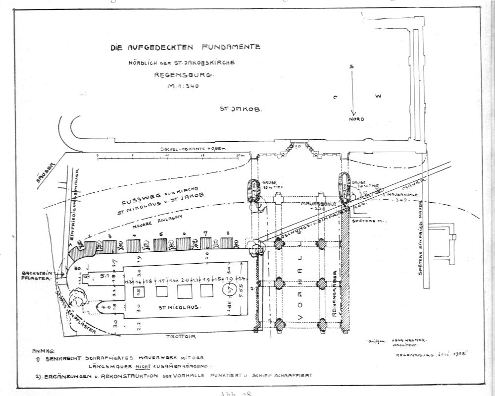 unmittelbaren Beziehung zum Nordportal zu stehen. Nicht unwahrscheinlich ist es auch, dass die schiefe Mauer mit der Südwestecke von St. Nicolaus in der im Plan angegebenen Weise verbunden war.