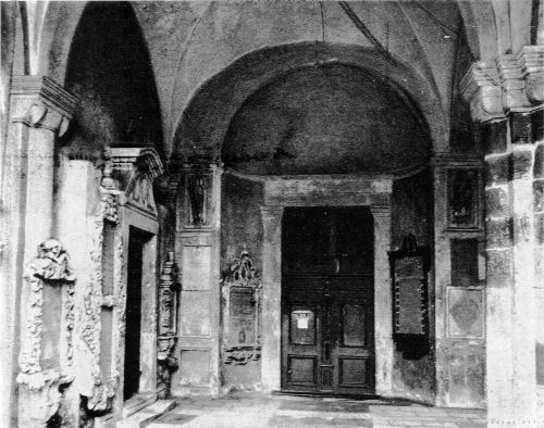 Aus der Vorhalle geht man mittelst zweier Thüren in das nördliche Seitenschiff der Kirche. Jede derselben, von viereckiger Form, bildet den Hintergrund einer halbkreisförmigen Nische, deren jede einen Halbmesser von 14 Fuss hat. Beide Nischen werden durch einen Zwischenpfeiler von 4 Fuss Breite von einander getrennt und ein eben so breiter Pfeiler begrenzt die andere Seite einer jeden Nische, so dass diese Nischen mit ihren einschliessenden Pfeilern den ganzen Hintergrund der Halle von 40 Fuss Breite einnehmen. Die Einfassungen der Nische sind völlig glatt und ohne alle Ornamentirung. In der Kämpferhöhe läuft ein zierliches Gesims um das Innere der Nische herum, das sich nächst den Seiten consolenartig verkröpft, aber nicht bis an die Vorderseite der Wand vortritt. Oberhalb der Thüren, welche 7 Fuss lichte Breite haben, bildet dieses Gesims die Oberkante eines sonst ganz glatten Architravs, der über den die Thür einfassenden Pilastern als grader Thürsturz aufliegt. Diese Thür, mit ihren sie begränzenden Pilastern, deren Kapitäle allseitig ausladen, und der Architrav darüber, gewähren einen fast griechischen Anblick, der dadurch nicht