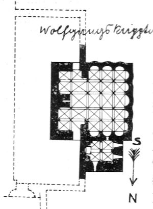 Bei der Betrachtung des Grundplanes fällt nicht nur die zweischiffige Anlage, sondern auch die grosse Unregelmässigkeit in Stellung und Grösse der Pfeiler- bezw. Säulenfundamente auf, ganz abgesehenvon den ja im Mittelalter nicht selten vorkommenden Abweichungen vom rechten Winkel und der nicht ganz parallelen Lage zur Klosterkirche; die annähernd gleichlaufende Richtung weist jedoch auf einen baulichen Zusammenhang hin, der aber noch keinen Hinweis dafür gibt, welchem der beiden Bauten die Priorität zuzuerkennen ist.