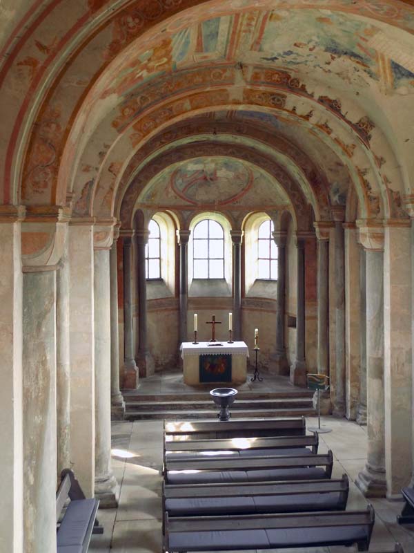 Das Innere war außer den Apsidenfenstern mäßig durch 6 gleich große Fenster (4 im Langhause und 2 im Querschiffe) erleuchtet, deren ursprüngliche Höhe derjenigen der über den beiden einander gegenüberliegenden Thüren noch jetzt in ihrer ursprünglichen Größe befindlichen Fenster glich. Die übrigen Fenster sind jetzt, um mehr Licht im Innern zu gewinnen, nach unten verlängert. Von den beiden dem Thurme zunächst liegenden ebengenannten Thüren ist die nördliche seit längerer Zeit vermauert, und nur die südliche dient als Eingang. Der Thurm ist auf die innere Höhe der Kirche in zwei ziemlich gleich hohe mit Kreuzgewölben überspannte Geschosse abgetheilt, von denen das untere durch eine weite Oeffnung mit dem Innern der Kirche verbunden und an der Westseite durch eine Thür zugänglich, eine Vorhalle bildete. Zum zweiten Geschosse gelangt man durch eine in der nördlichen deshalb verstärkten Thurmmauer angelegte Treppe, wo man eine Kapelle mit einer in die Ostwand eingeschnittenen Apsis, in welcher noch jetzt der alte steinerne Altartisch steht, vorfindet, welche mit dem Innern der Kirche durch zwei zu beiden Seiten der Apsis angelegte im Rundbogen geschlossene und durch einen Pfeiler mit kleinen Bögen getheilte Doppelfenster communicirt.