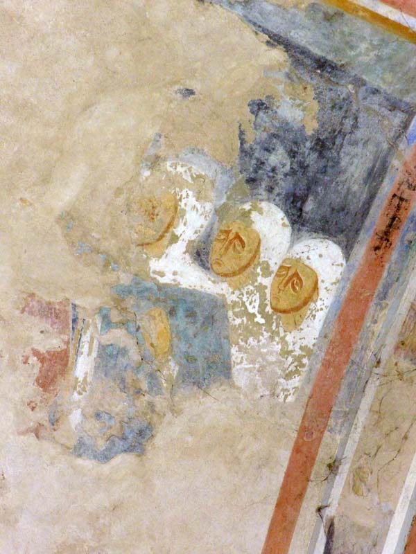 Die, um es gleich zu sagen, sehr byzantinisch anmutende Taufszene des Vierungsgewölbes zeigt in der Mitte eine kreuzförmige Kufe 4, in deren vorderen Enden Täuflinge stehen, während davor eine bärtige, segnende Gestalt — doch wohl Christus — erscheint. Die Gruppen vollfiguriger Gestalten werden links von Petrus geführt, der in der Linken ein aufgeschlagenes Buch mit dem Texte: »Baptizo vos in nomine P.(atris) F.(ilii) S.(piritus)« hält und mit der Rechten einen Segensgestus ausführt; gefolgt von drei Jüngern, denen die gleiche Zahl auf der rechten Seite entspricht. Während im nördlichen Querschiffarm historische Taufszenen dargestellt sind (Petrus tauft Cornelius und sein Haus), handelt es sich bei dieser Szene scheinbar mehr um eine solche symbolischen Charakters, die das Sakrament der Taufe in allgemeinerem Sinne verherrlichen will. Da die Kirche den elftausend Jungfrauen geweiht war (s. o. »ad honorem undecim milium virginum«), dürften die in Rundmedaillons dargestellten Frauen im Tonnengewölbe des Vorchors wohl diese Heiligen darstellen. (Vermutlich befinden sich weitere Szenen dieser Legende unter der Tünche der Gewölbe des Langhauses.) Die leider stark beschädigte Gestalt Christi als Weltenrichter im Halbrund der Apsis läßt aber wenigstens noch deutlich den eindrucksvollen, bärtigen Kopf des Herrn erkennen. Auf der Szene der Arche Noahs und der Taube ist der Kopf Noahs leider stark beschädigt. Zur Ergänzung lassen sich Köpfe in ähnlichen Haltungen aus der Szene der Verklärung Petri (vom nördlichen Querhausarm) heranziehen (Taf.88/2, 87/3).