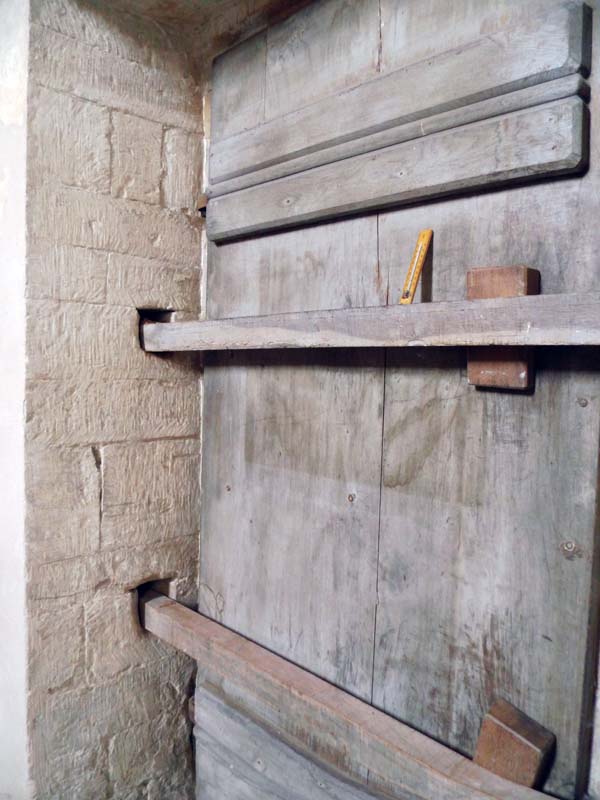 An dem Figur 2 dargestellten Portale der Südseite ist die aus verdoppelten Bohlen mit Eisenbeschlag versehene alte Thür interessant, insbesondere durch den inneren Schubriegel von circa 6 Zoll □ starkem Holze, der sich in einem im Mauerwerke angelegten Canale versteckt, und beim Gebrauche bis zum gegenüberliegenden Gewände gezogen wird, wo er zum Auflager eine entsprechende Oeffnung findet, aus welcher gewaltigen Sicherheitsmaßregel sich vermuthen läßt, daß die Kirche der kleinen Gemeinde als Versteck und Festung bei räuberischen oder feindlichen Ueberfällen zugleich außer ihrem eigentlichen Zweck diente.