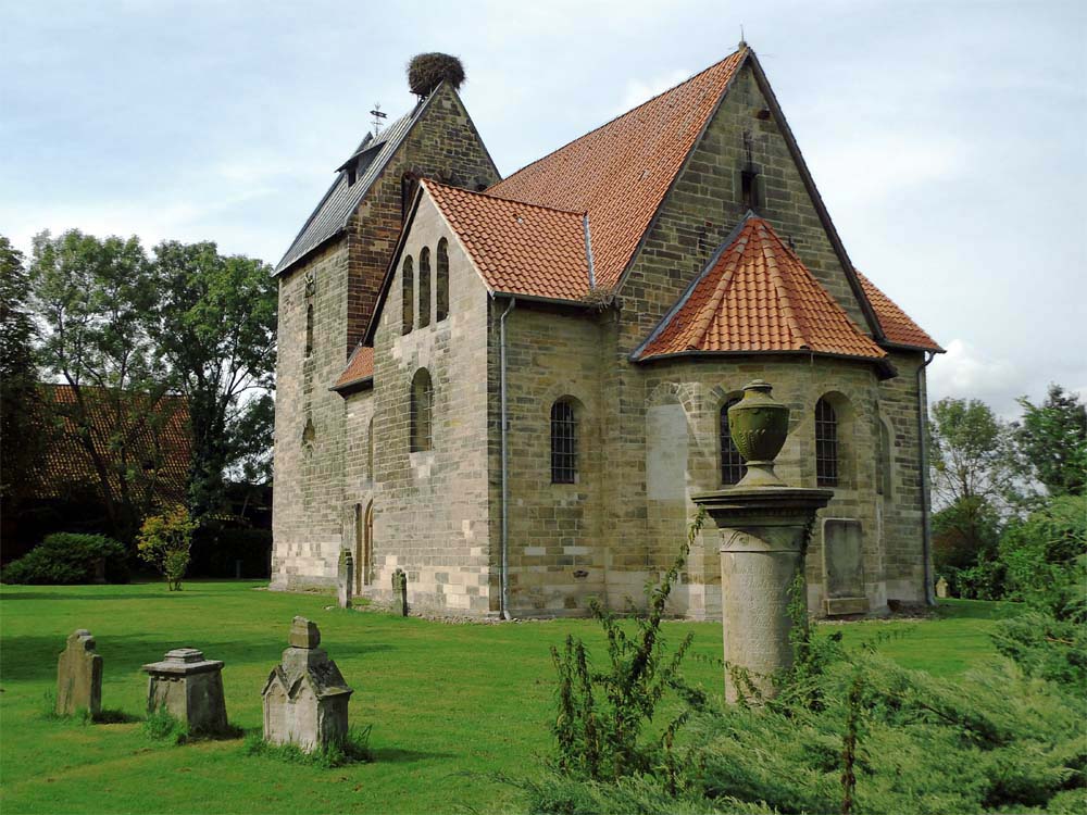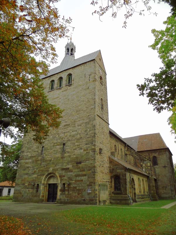Das Aeußere der Kirche ist zwar durchaus schmucklos, aber wie der alte Chronist auch sagt, durchaus sorgfältig aus wohl bearbeiteten Quadersteinen (wahrscheinlich aus dem nahen Rehburger Berge) in gutem Verbande aufgeführt, und ist so wohl erhalten, daß man kaum glauben möchte eine Kirche des XII. Jahrhunderts zu sehen; nur an der Nordwestseite hat der Thurm (anscheinend durch heftigen Brand anstoßender Gebäude) gelitten.
