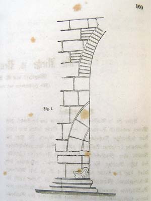 Bei der mehrfach erwähnten Erhöhung der Arcaden sind die Anfänger der neuen Bögen bedeutend höher gelegt; unterhalb derselben sieht man an den Kanten noch den den früheren Bogen einfassenden Rundstab (Holzschnitt Fig. 1.) gegen die vertikal gemeißelten Kanten verlaufen. Ob die alten Arcaden im Rund- oder Spitzbogen geschlossen waren, ist aber daraus nicht zu erkennen; doch dürfte man mit einiger Sicherheit den Spitzbogen annehmen.