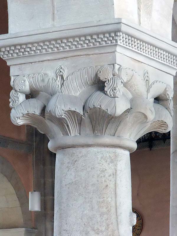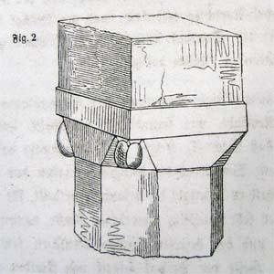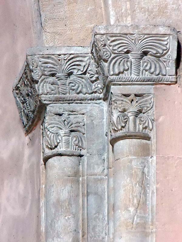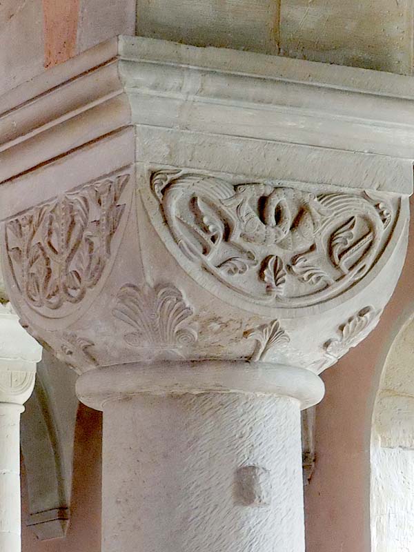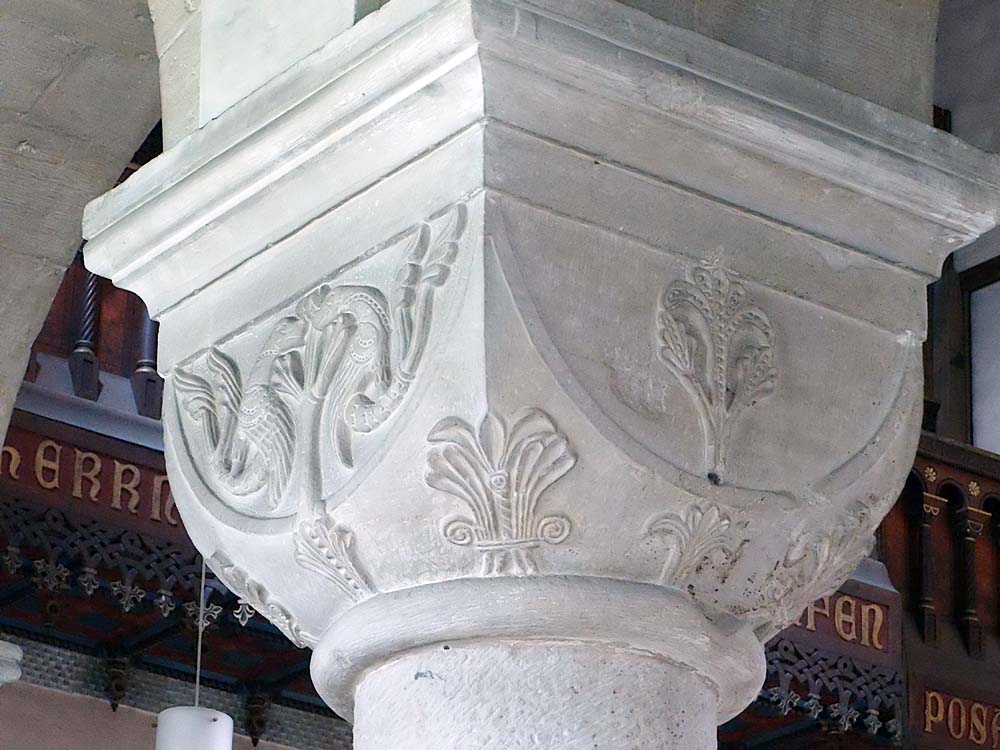 Pfeiler zeigt westlich eine einfache Uebergangsforrn aus dem Achteck des Pfeilers zum Viereck des Abacus; östlich ist der Uebergang durch einen kugelförmigen Auswuchs belebt (Holzschnitt Fig. 2.).