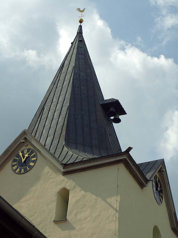 Von den drei im Thurme hängenden Glocken sind die beiden untern aus dem 17.Jahrhundert, während die kleinere ohne Inschrift nur mit zwei aus Draht eingelegten einander gegenüberstehenden Kreuzen versehen, ihrer Form nach dem 12. Jahrhunderte angehören möchte. (Siehe Taf. 32. Abbild. 7.)