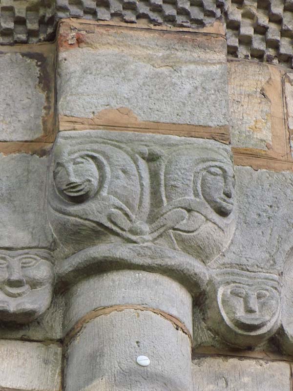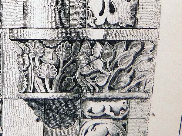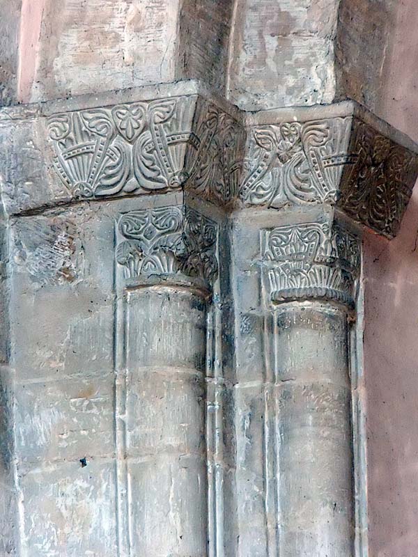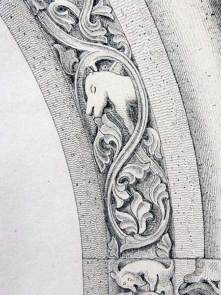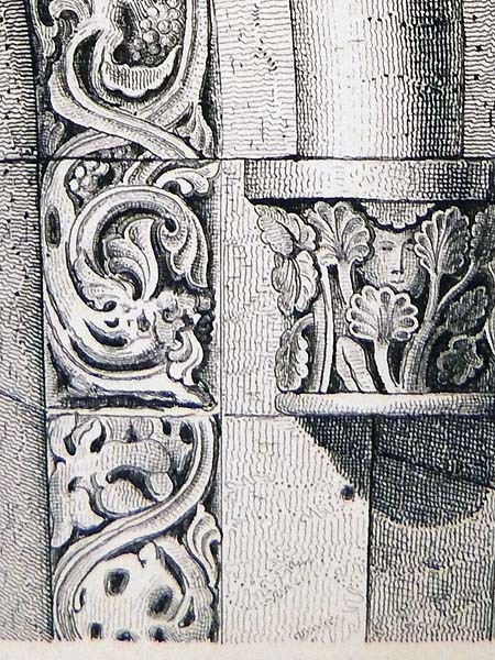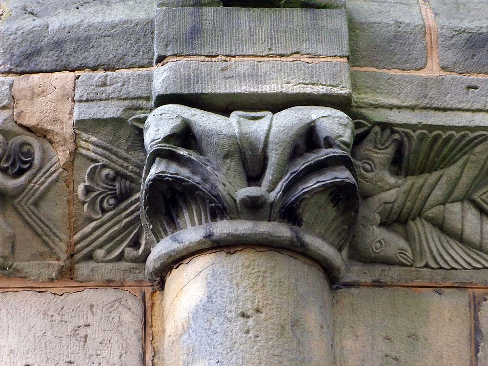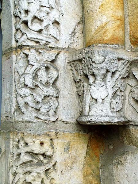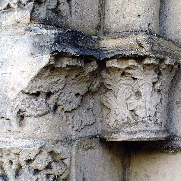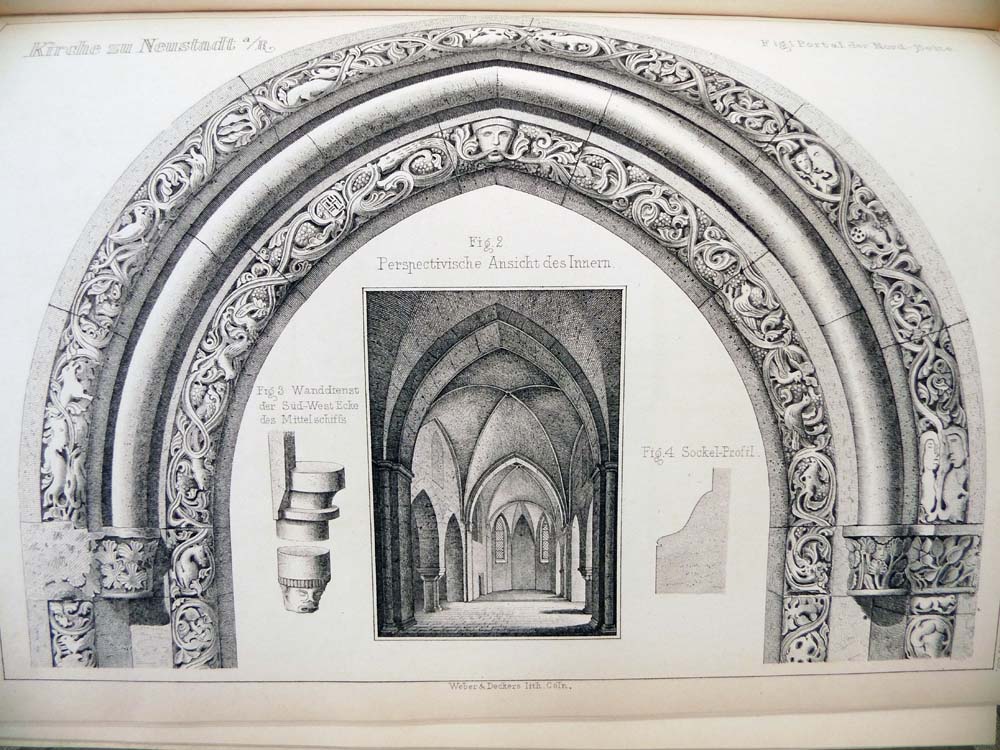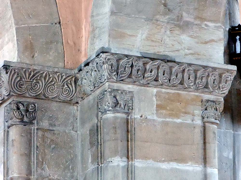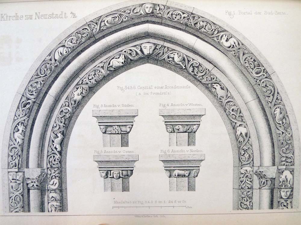 Den südlichen Pfeiler, dessen Kapitäl an den 4 Ecken durch die kaum erkennbaren Evangelistenzeichen, an den 4 Fronten durch die Darstellungen eines Stiers, eines Drachen, eines menschlichen Kopfes und eines rosettenförmigen Ornamentes in roher Weise ausgezeichnet ist, haben wir Blatt 40, Fig. 3, 4, 5, 6 abgebildet Mit größerer Geschicklichkeit ist die in weichem Sandstein ausgeführte und deshalb leider schon stark verwitterte Ornamentation der beiden einander gegenüberliegenden Portale (siehe Blatt 39 und 40) ausgeführt. Die Kapitäle des Inneren, bereits die gotische runde Form, und ihre naturalistische Decorationsweise kündet ebenfalls schon den