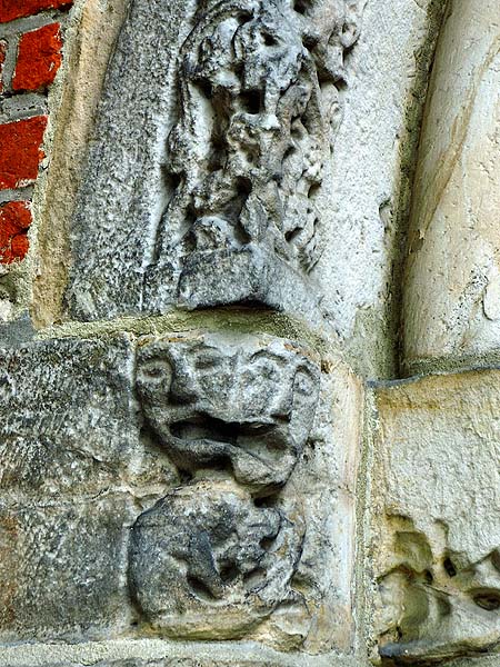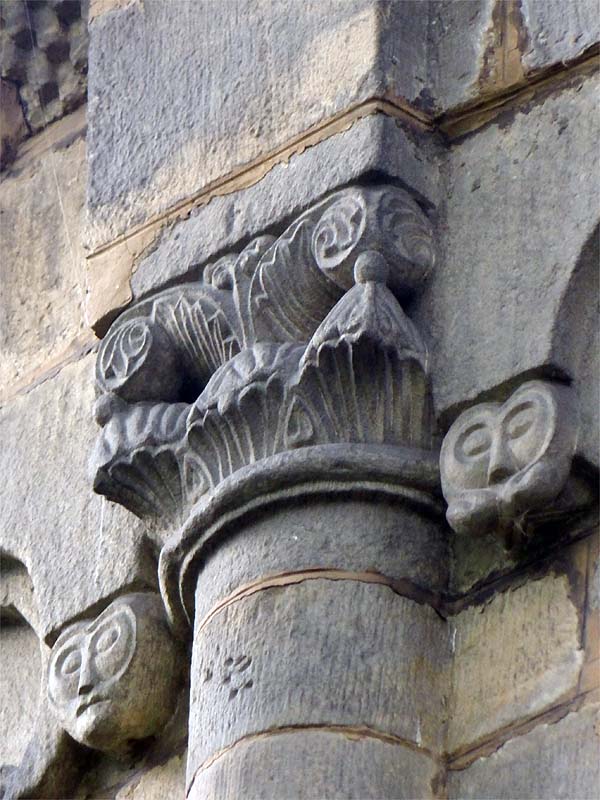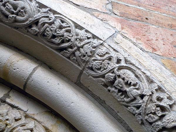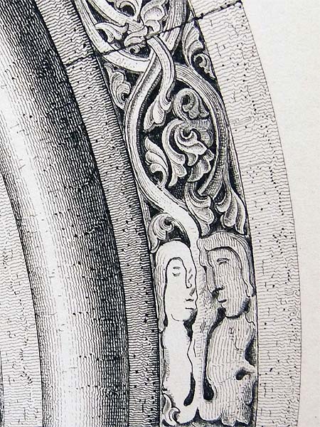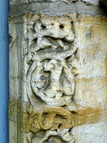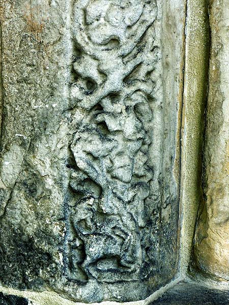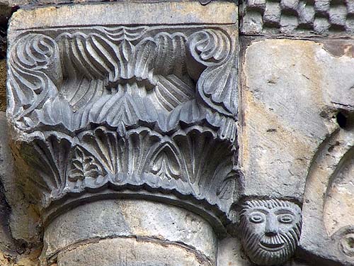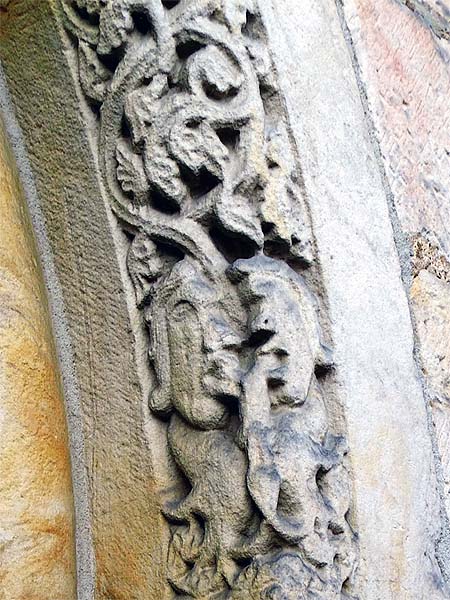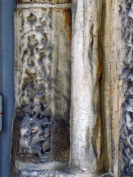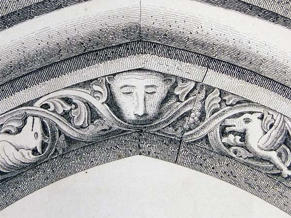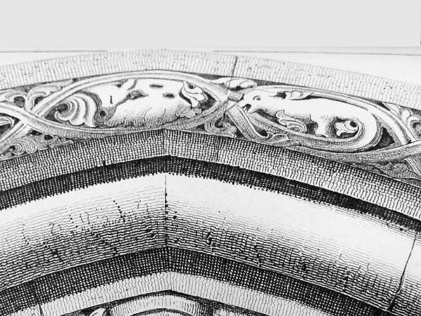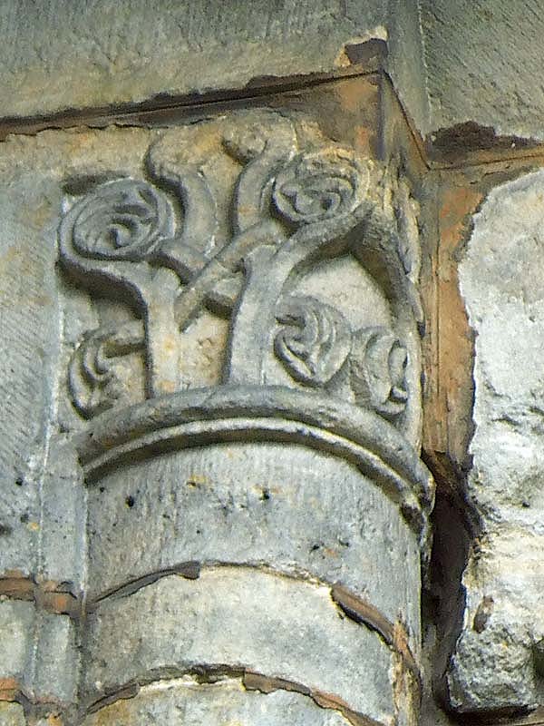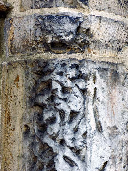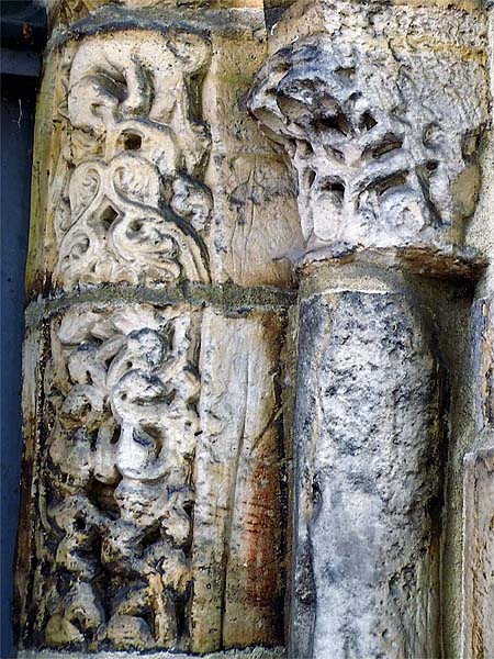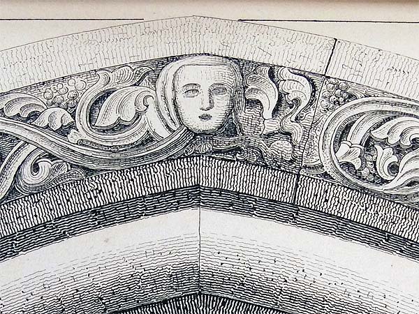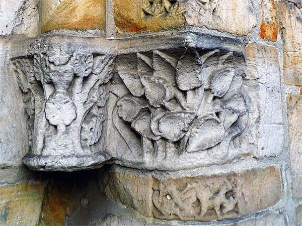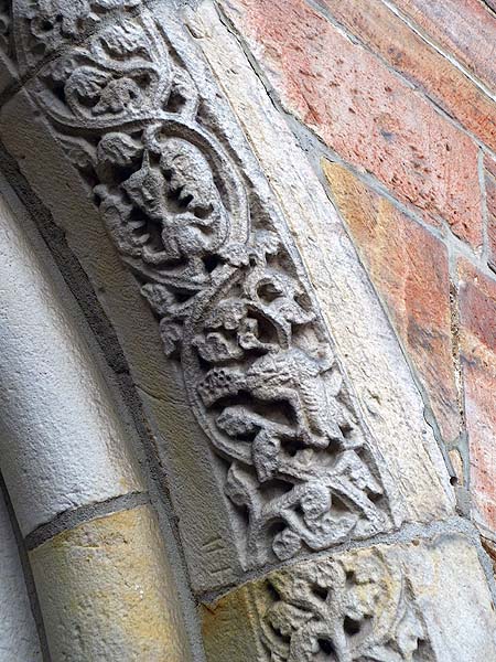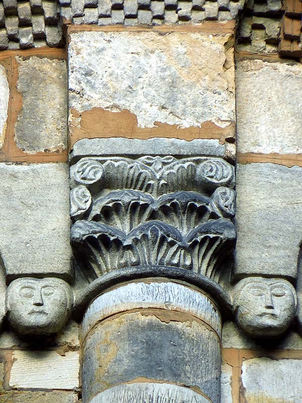 Den südlichen Pfeiler, dessen Kapitäl an den 4 Ecken durch die kaum erkennbaren Evangelistenzeichen, an den 4 Fronten durch die Darstellungen eines Stiers, eines Drachen, eines menschlichen Kopfes und eines rosettenförmigen Ornamentes in roher Weise ausgezeichnet ist, haben wir Blatt 40, Fig. 3, 4, 5, 6 abgebildet Mit größerer Geschicklichkeit ist die in weichem Sandstein ausgeführte und deshalb leider schon stark verwitterte Ornamentation der beiden einander gegenüberliegenden Portale (siehe Blatt 39 und 40) ausgeführt. Die Kapitäle des Inneren, bereits die gotische runde Form, und ihre naturalistische Decorationsweise kündet ebenfalls schon den