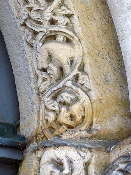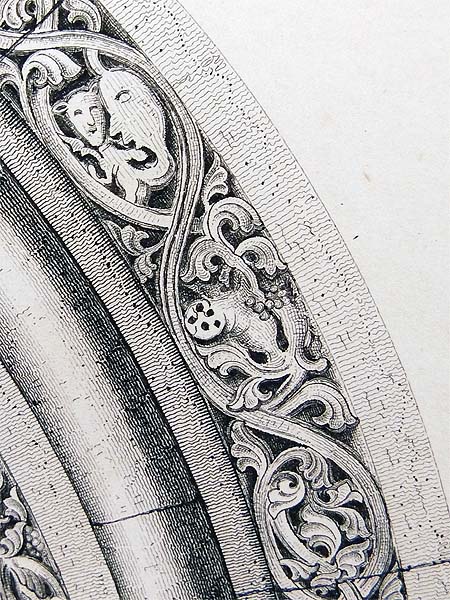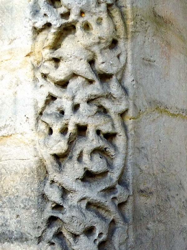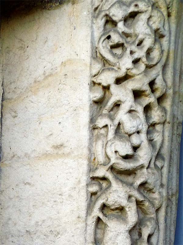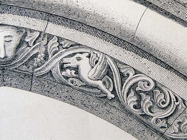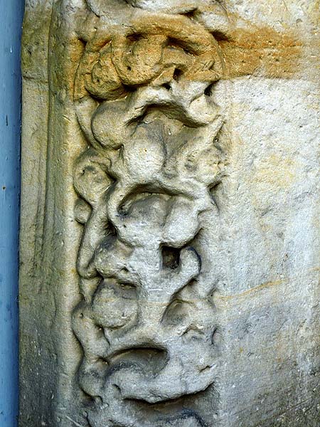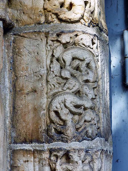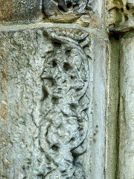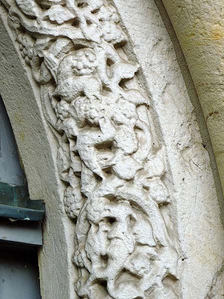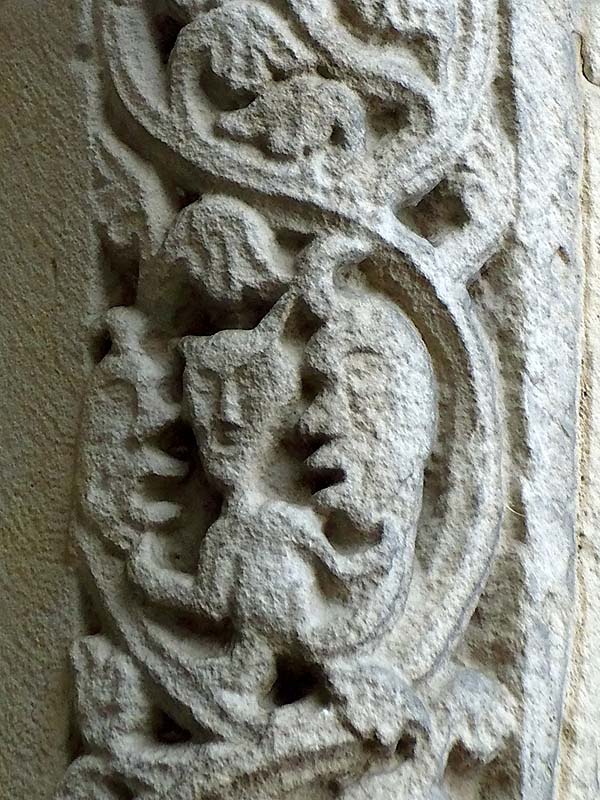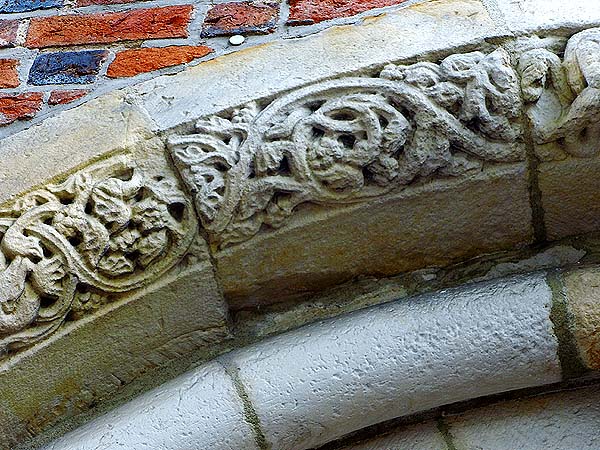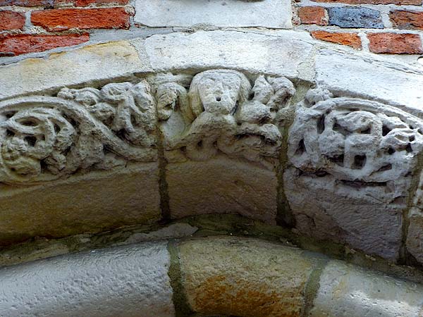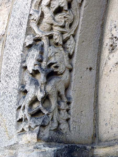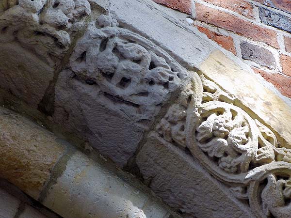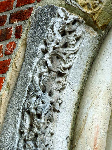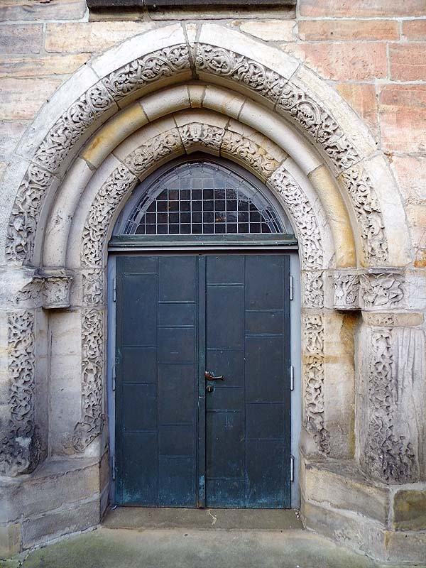 Den südlichen Pfeiler, dessen Kapitäl an den 4 Ecken durch die kaum erkennbaren Evangelistenzeichen, an den 4 Fronten durch die Darstellungen eines Stiers, eines Drachen, eines menschlichen Kopfes und eines rosettenförmigen Ornamentes in roher Weise ausgezeichnet ist, haben wir Blatt 40, Fig. 3, 4, 5, 6 abgebildet Mit größerer Geschicklichkeit ist die in weichem Sandstein ausgeführte und deshalb leider schon stark verwitterte Ornamentation der beiden einander gegenüberliegenden Portale (siehe Blatt 39 und 40) ausgeführt. Die Kapitäle des Inneren, bereits die gotische runde Form, und ihre naturalistische Decorationsweise kündet ebenfalls schon den